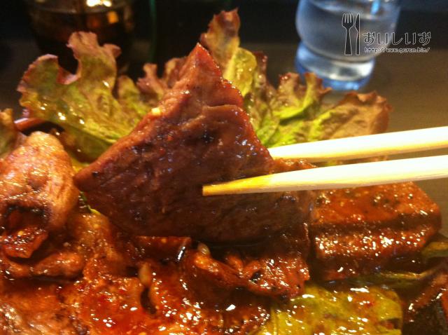 店員さんが焼いたお肉をちょきちょきはさみで切りながら丼に盛り付けていきます。 5分も待たないうちに到着!カルビ・ハラミ・豚肉の三種がふんだんに乗っかってますねぇ( ´)Д(`) いただきます!!