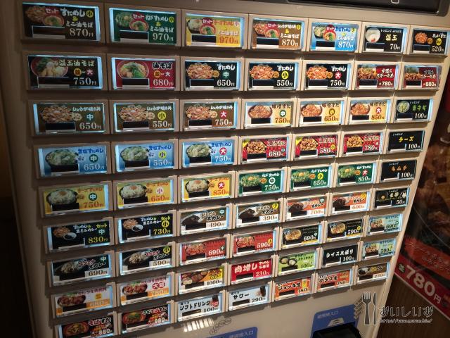 いざ出陣!店内へ入ると券売機が。 はえ~、種類がいっぱいあって困ってしまいますね・・・黒カレーってなんだろう?タルタル唐揚げ丼も興味をそそります。 色々あるけど今回はこっちの「中落ちステーキ丼(750円)」を選ぶぜ!ピッ