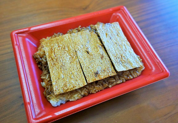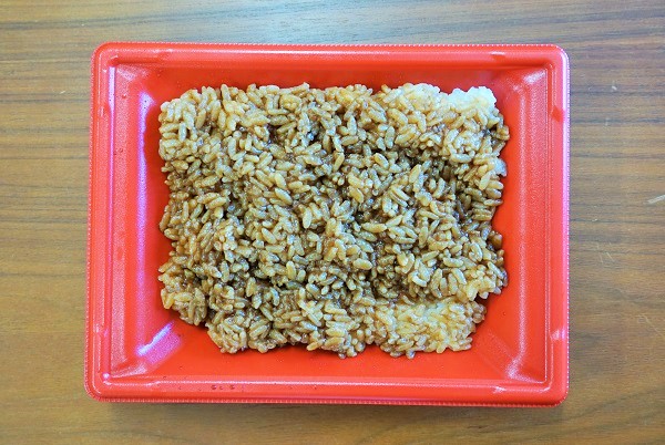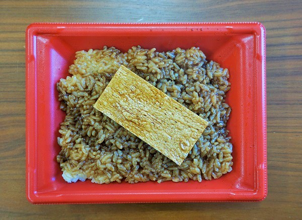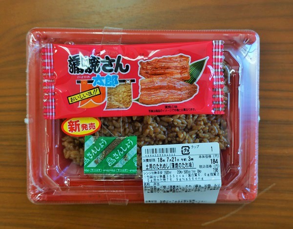 パックの中には、タレがかかった茶色い飯が詰められている。レンジで温めると甘く香ばしいタレの匂いが漂い、食欲が刺激される。これに「蒲焼さん太郎」を乗せたが、米の上に駄菓子が1枚だけ乗っている姿を見ると気持ちまで貧相になる。