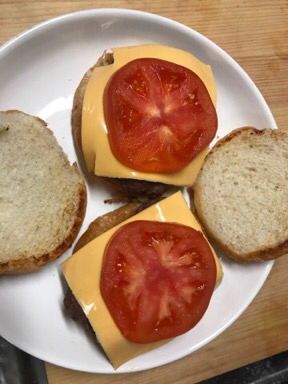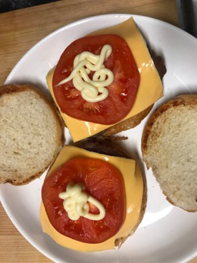 はじめはパテだけ、チーズたしたらいい、トマト入れたらgood 次はレタスかな