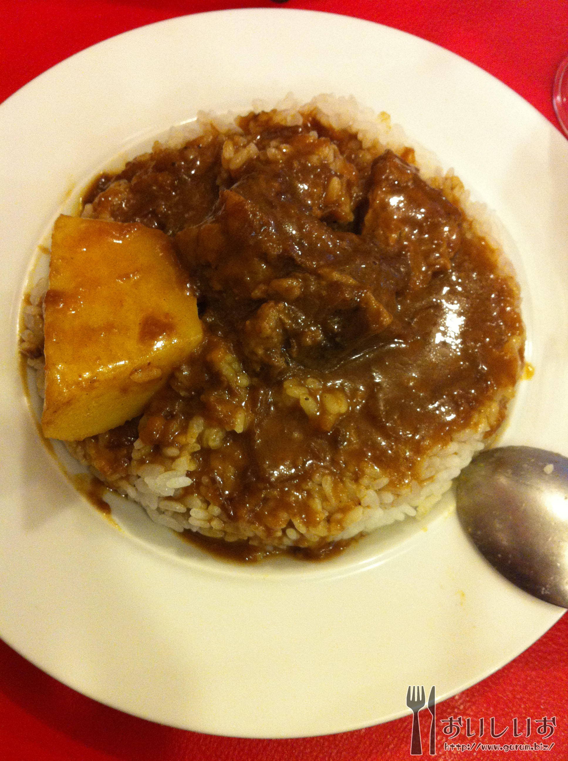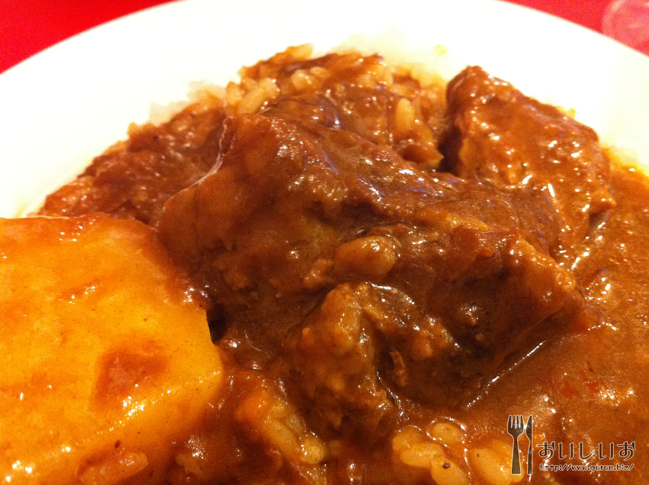 と、とりあえずかけてみたよ(´・ω・`)大きい牛とじゃがいもが1つずつゴロッと入っております。かけかた汚いとか言わないでね!! 牛はとろとろやわらか!ルーはサラサラめ。