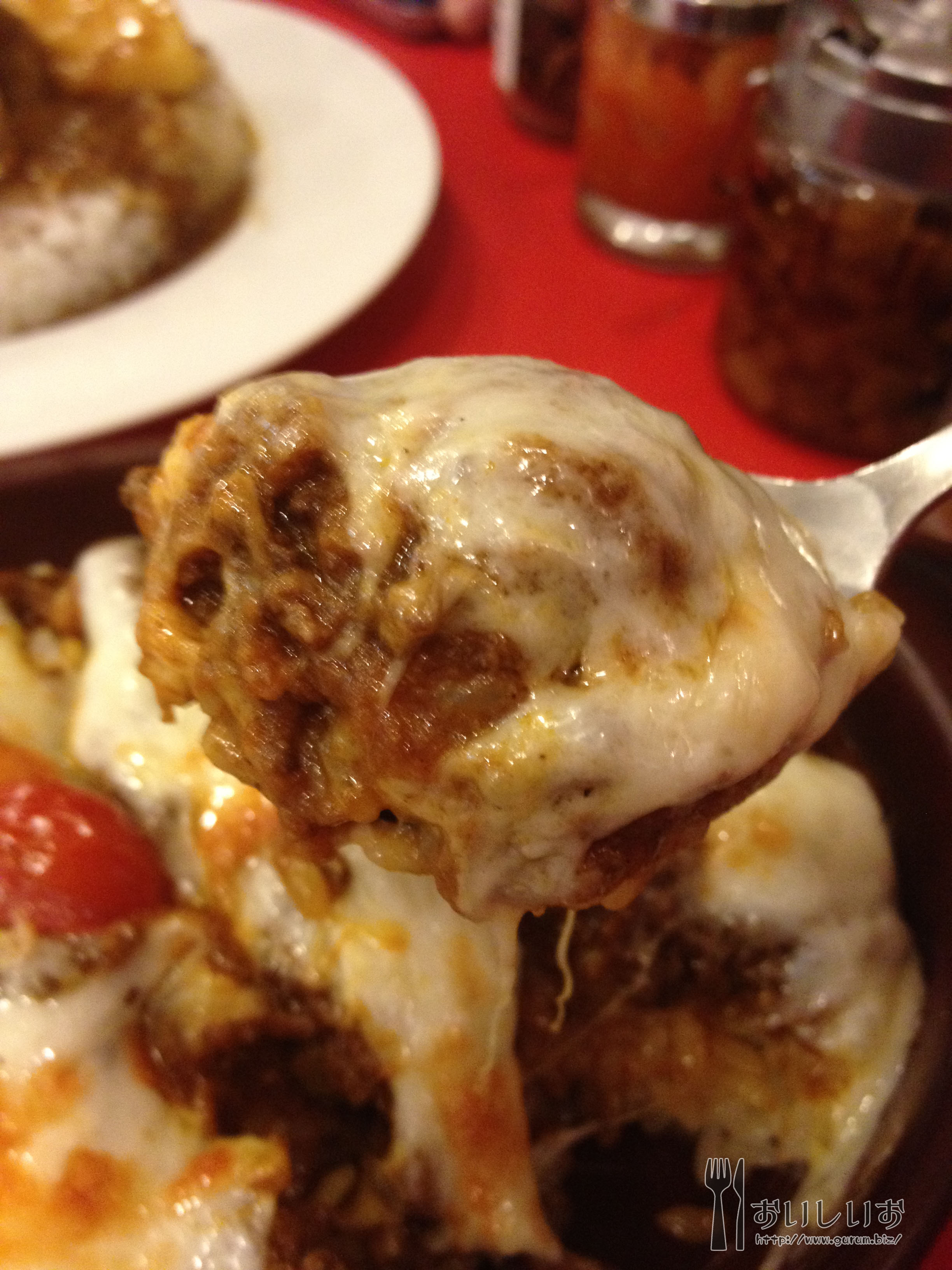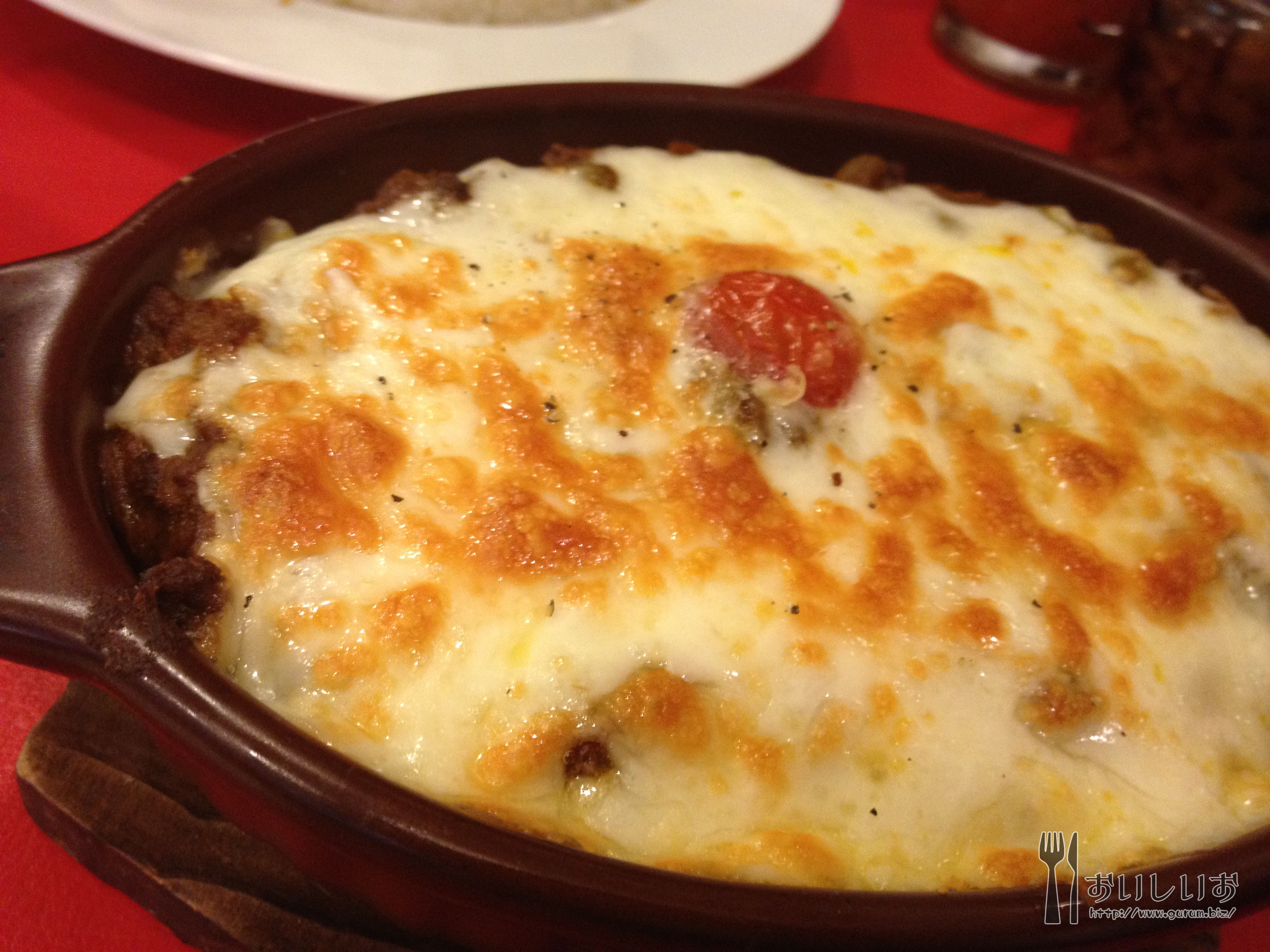 こちら焼きチーズのキーマカレー。チーズの香りが食指をそそりますな。 チーズがびよーんと伸びてあつあつ!ご飯の中にはグリーンピース。おいしい(*´ω`*) 辛さが★★☆☆だったんですが、辛かったwwwww水とラッシー攻めしながら食べました。
