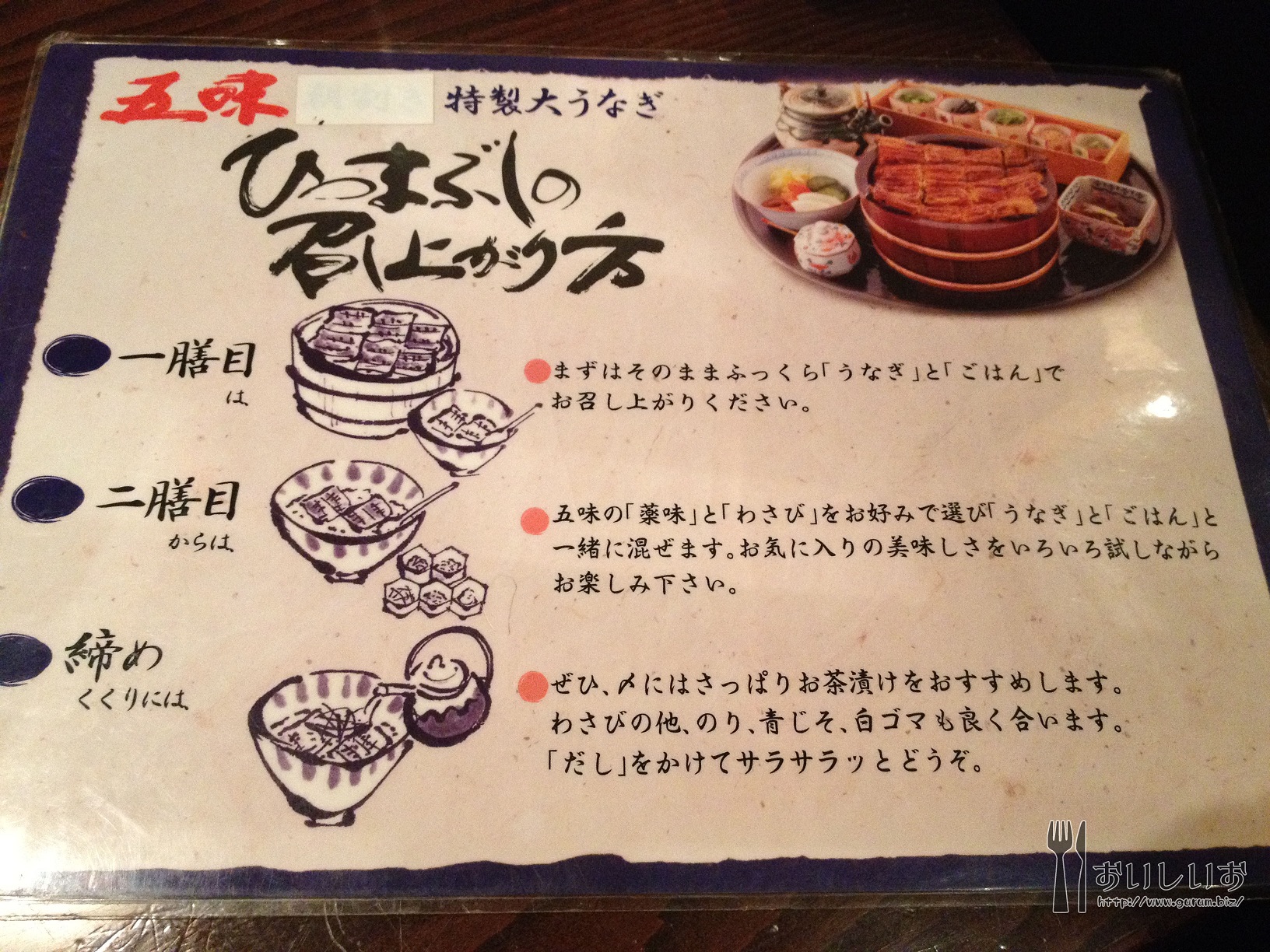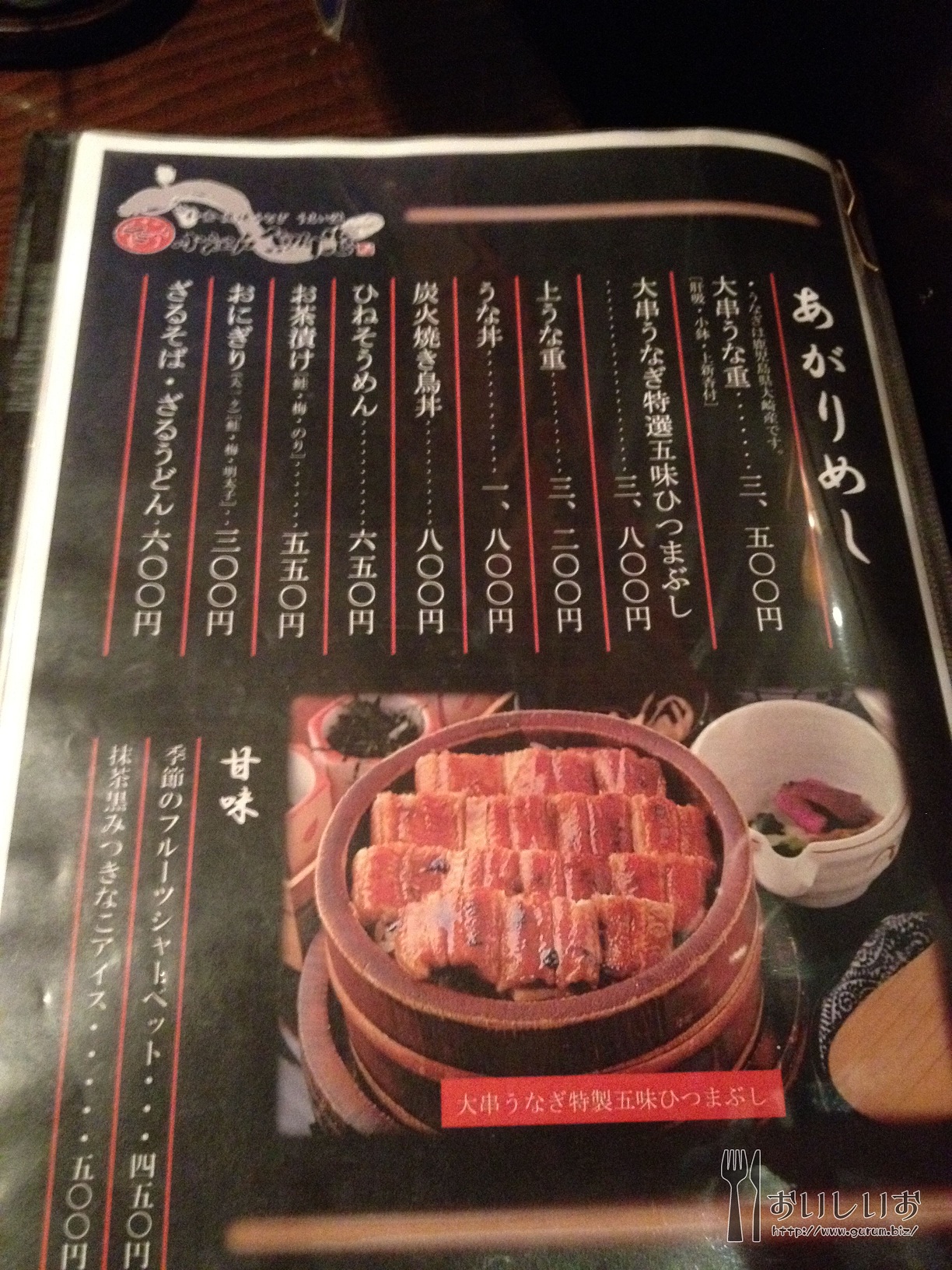 メニュー。うな重3000円とか高い・・・でもせっかくだから大串うなぎ特選五味ひつまぶし(3800円)と唐揚げを頼みました!! 今回一緒に来た友人は上うな重を注文。 32e6baa6.jpg