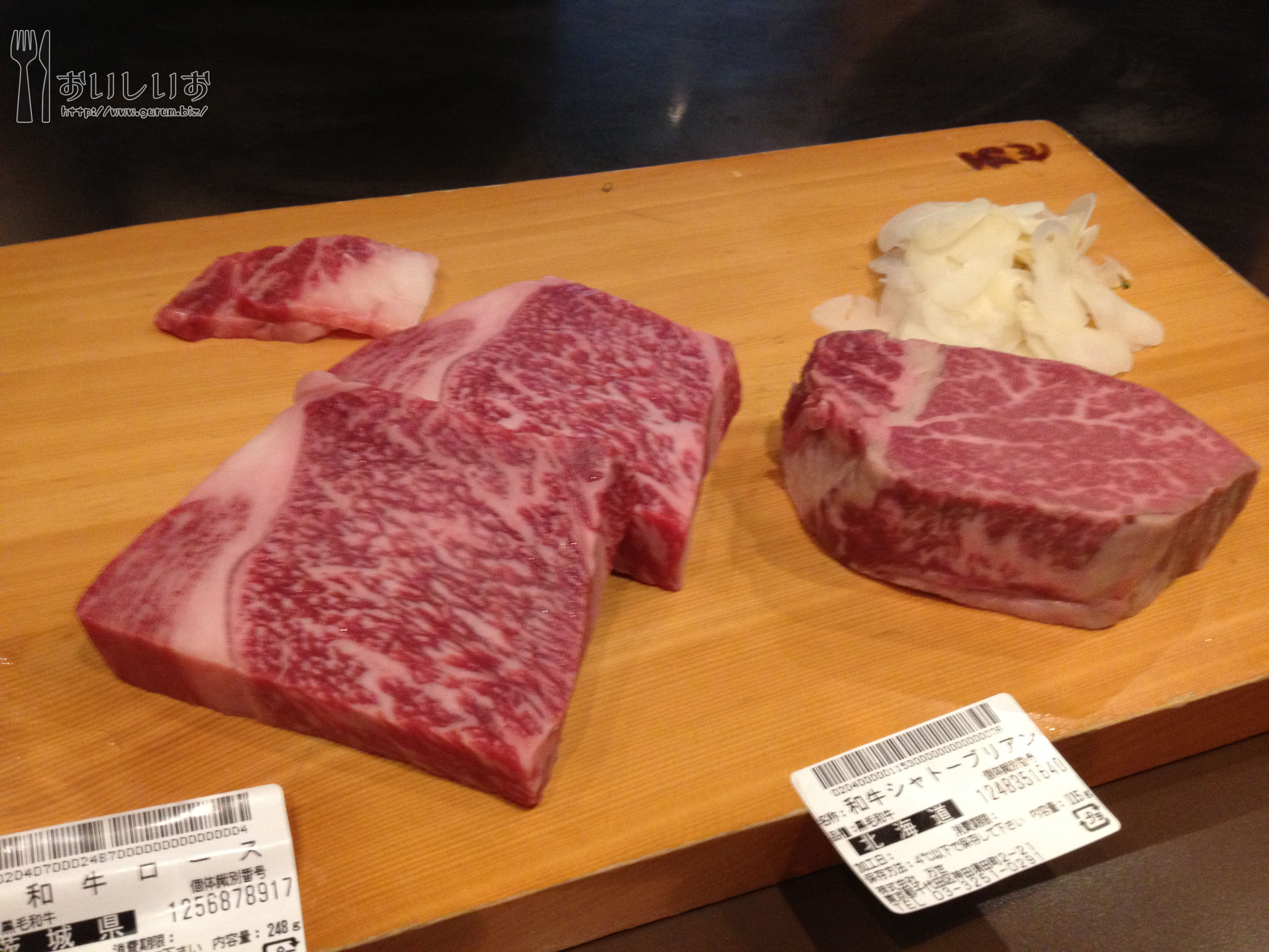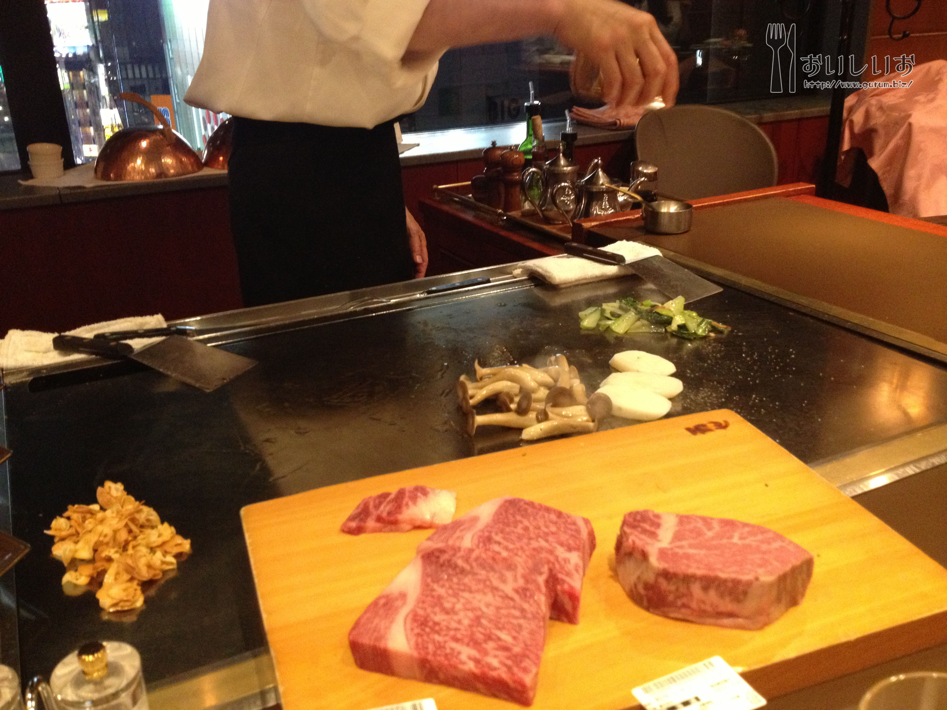 5:黒毛和牛ステーキ お待たせしました、魔王こと黒毛和牛ステーキのご登場です!シェフが目の前でやいてくれます! ちゃんとどこ産かラベルを見せてくれます。
