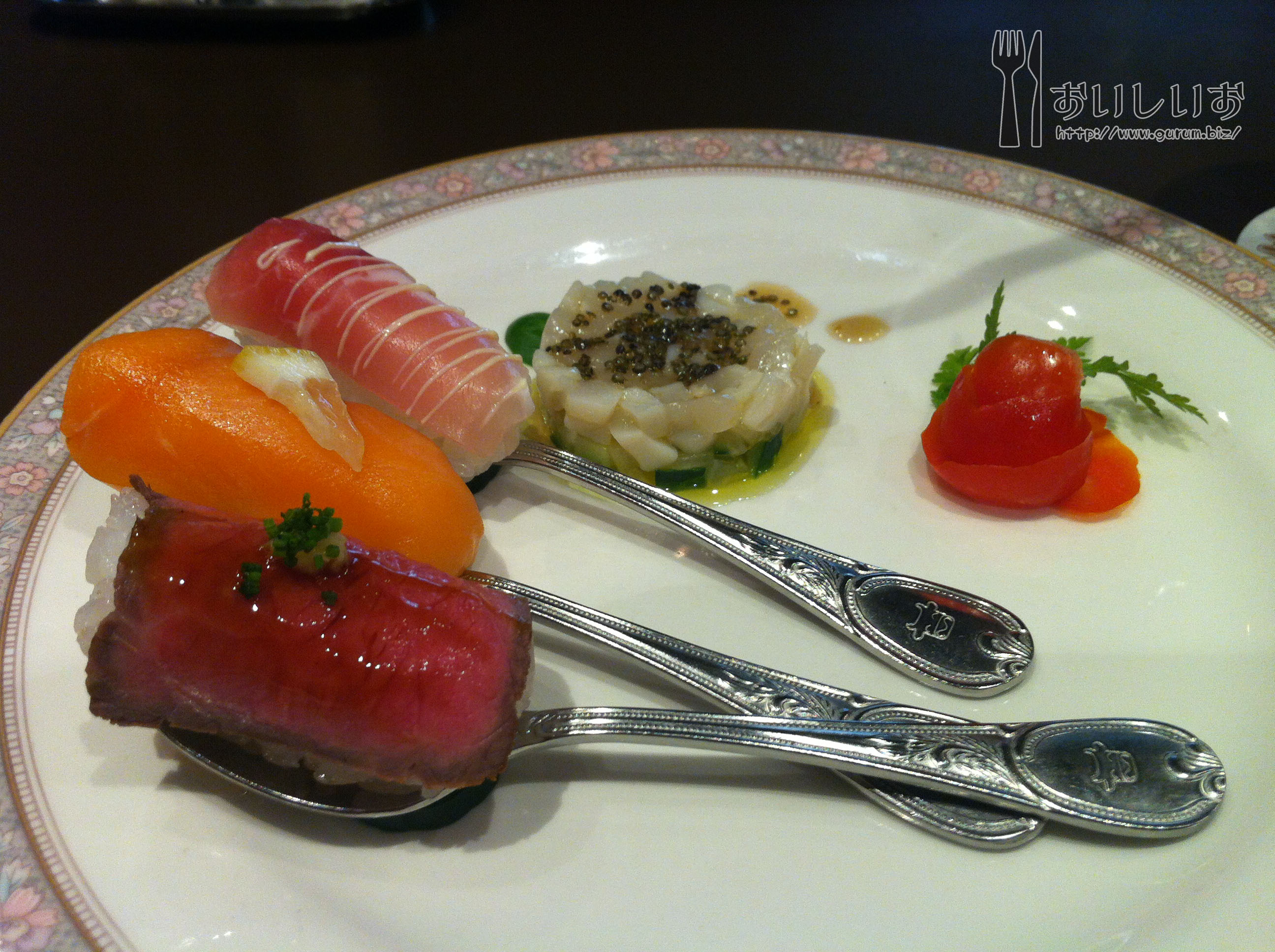 1.:オードブル 寿司!なんか肉の寿司北!あとサーモンと謎の添え物・・・スプーンの上に乗ってるのがおしゃれですね。
