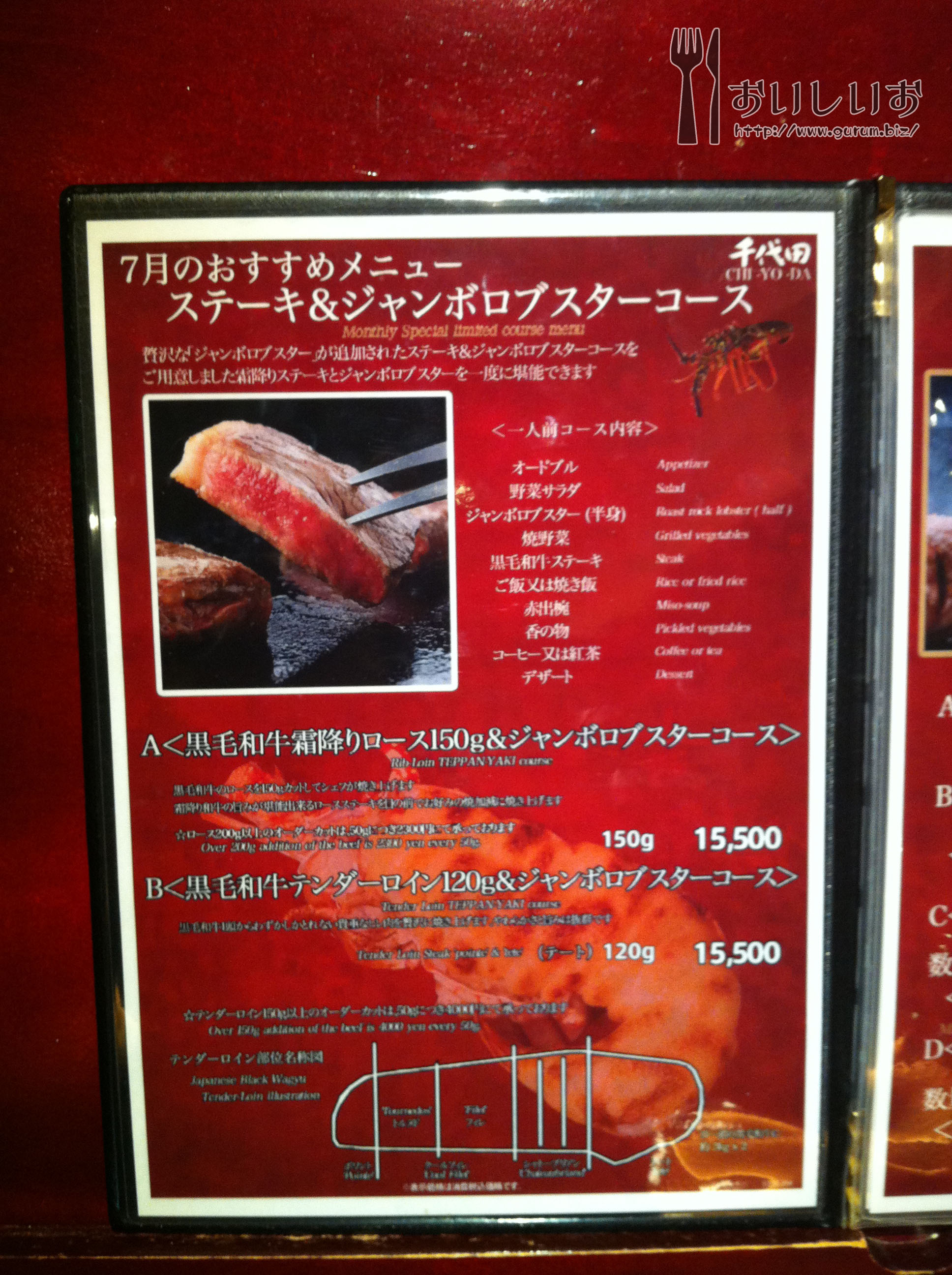 ちなみに今日は気前の良い友人が奢ってくれるということでこんな贅沢ができています。本当にありがとう! 店員さんに案内されメニューを吟味。はあー、たけえwwww なんか色々ありますがよくわからないので、「黒毛和牛霜降りロース150g&ジャンボロブスターコース(15500円)」にしました!15500円の飯ってどんなだよwwww コース料理とか知り合いの結婚式でしか食べたことないよ・・・ドキドキするよ(´・ω・`) 友人はシャトーブリアン200gを頼んでいました。