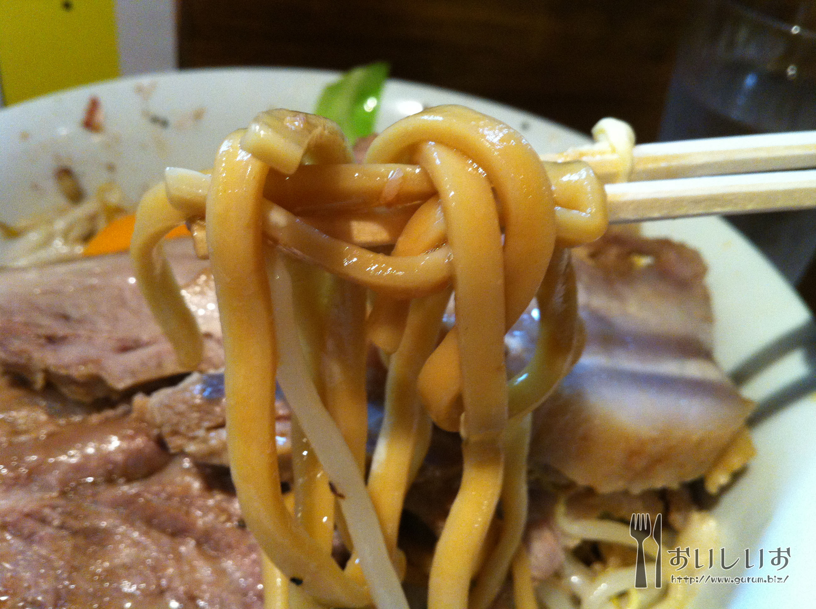 麺は太め固め。結構噛みごたえあります。スープはカラメにしたのでちょっとしょっぱめ。