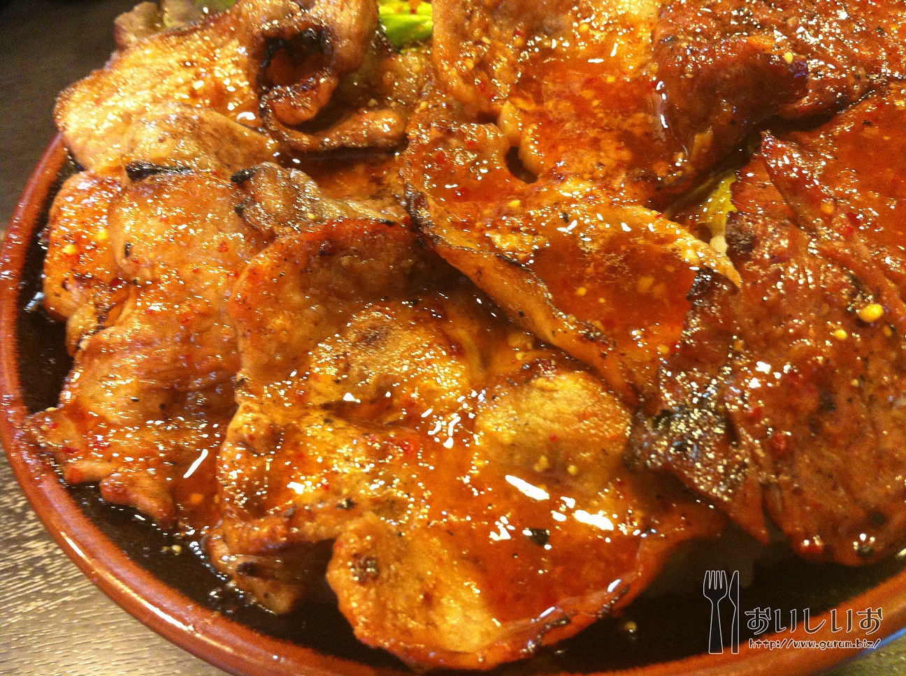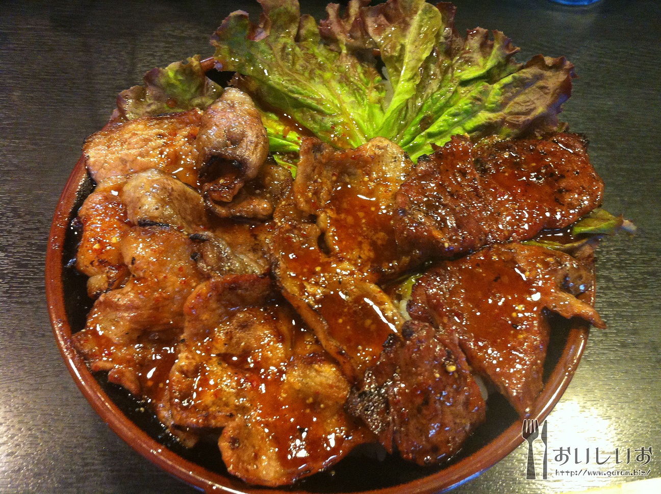 店員さんが焼いたお肉をちょきちょきはさみで切りながら丼に盛り付けていきます。 5分も待たないうちに到着!カルビ・ハラミ・豚肉の三種がふんだんに乗っかってますねぇ( ´)Д(`) いただきます!!