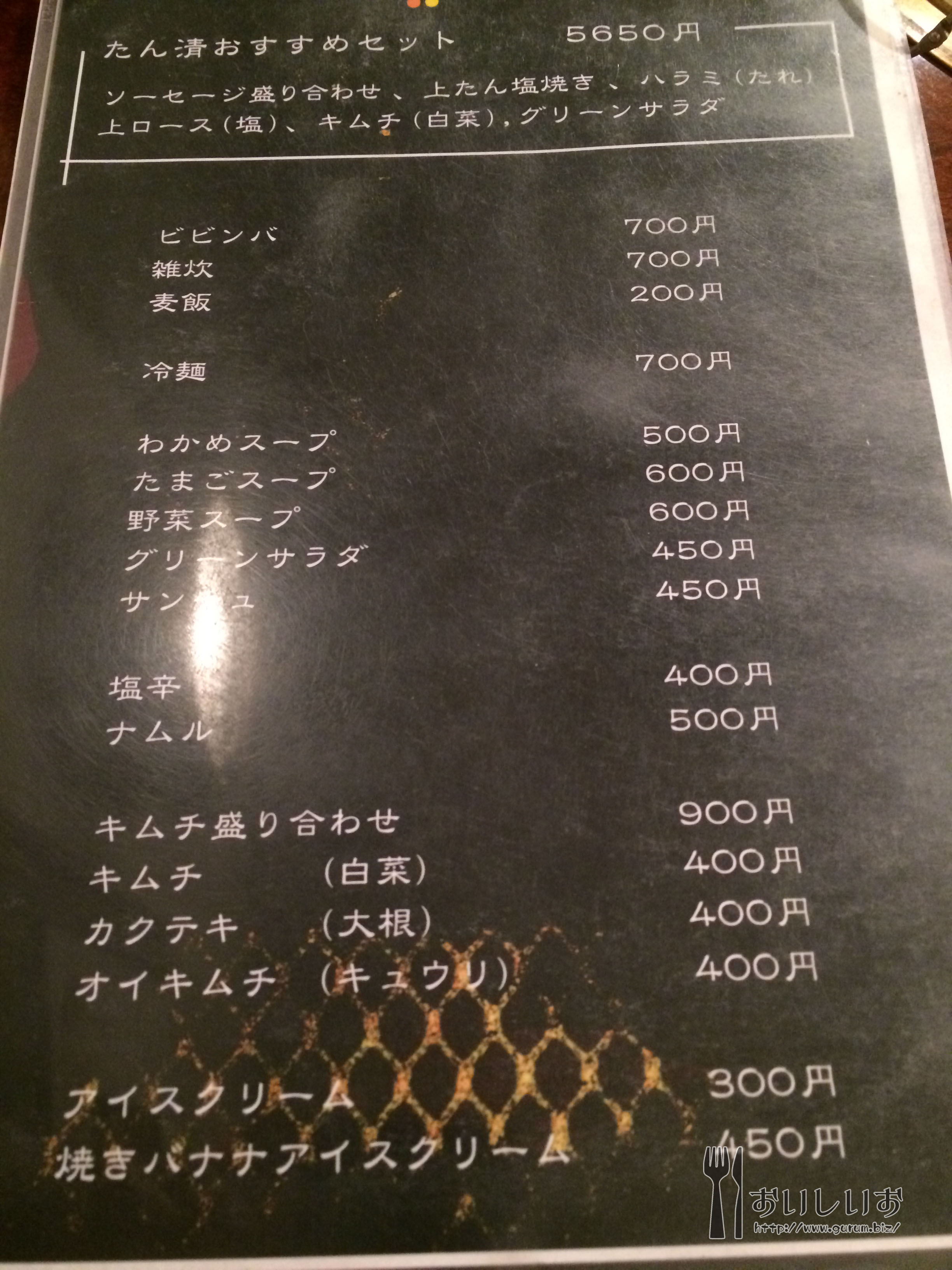 中はテーブル席多数で、中高年サラリーマンが多く、会社帰りに焼き肉食べながら一杯ひっかけてる感じでした! メニューがこちら。チェーン店に比べると少しお値段は高め。 単品で頼もうか悩みましたが、せっかくなので「たん清おすすめセット(一人前5650円)」にしました!味に期待!