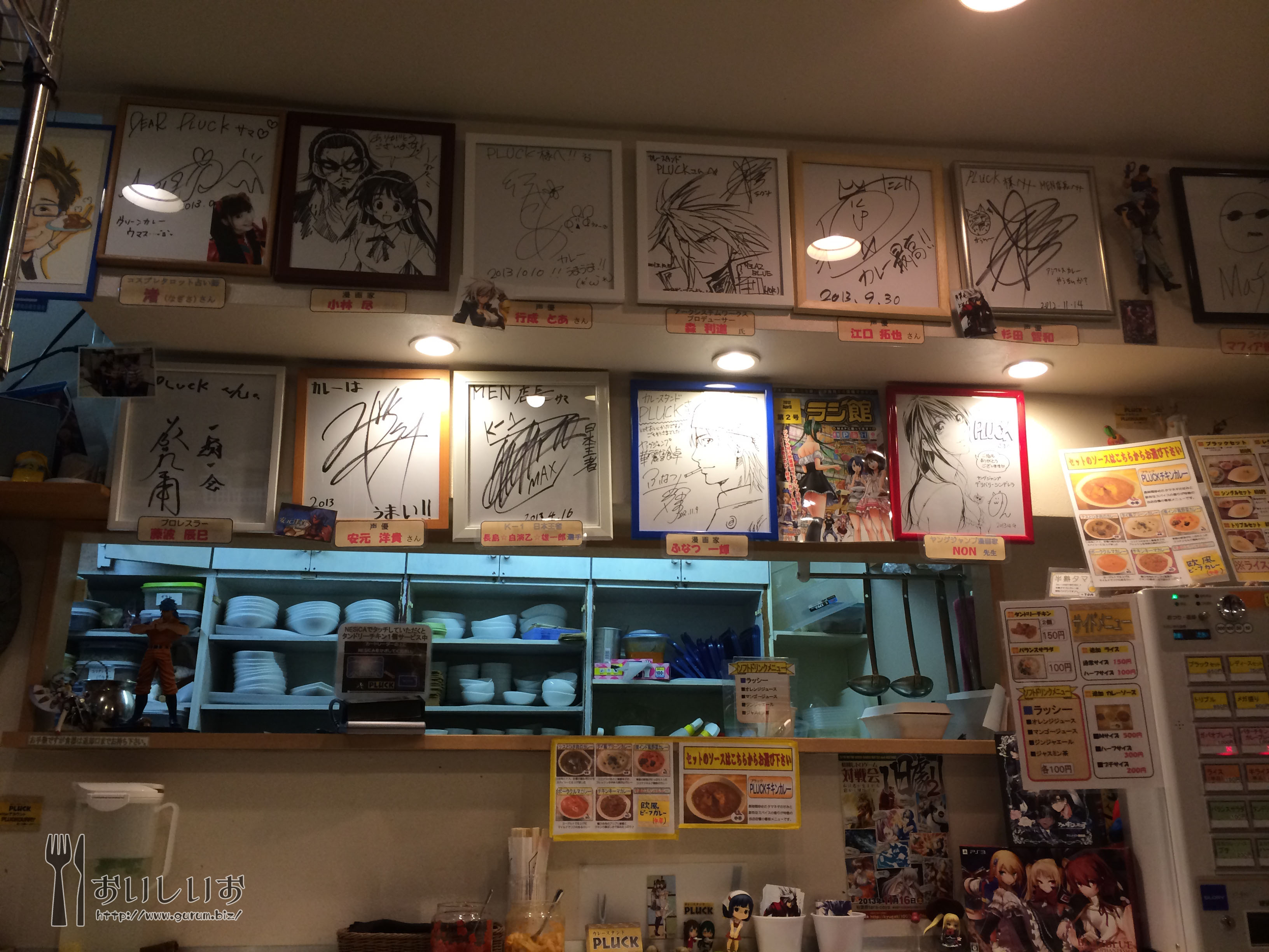 店内はテーブル席4つとカウンター席が5つくらいで、割りと小さめなお店でした。 特筆すべきは、所せましに並んでいるゲーム、アニメのグッズと壁に並んでるサイン。知っている有名人の方のサインがズラッと並んでいてびっくり!!杉田智和さんのサインも複数個所にあるらしいwww