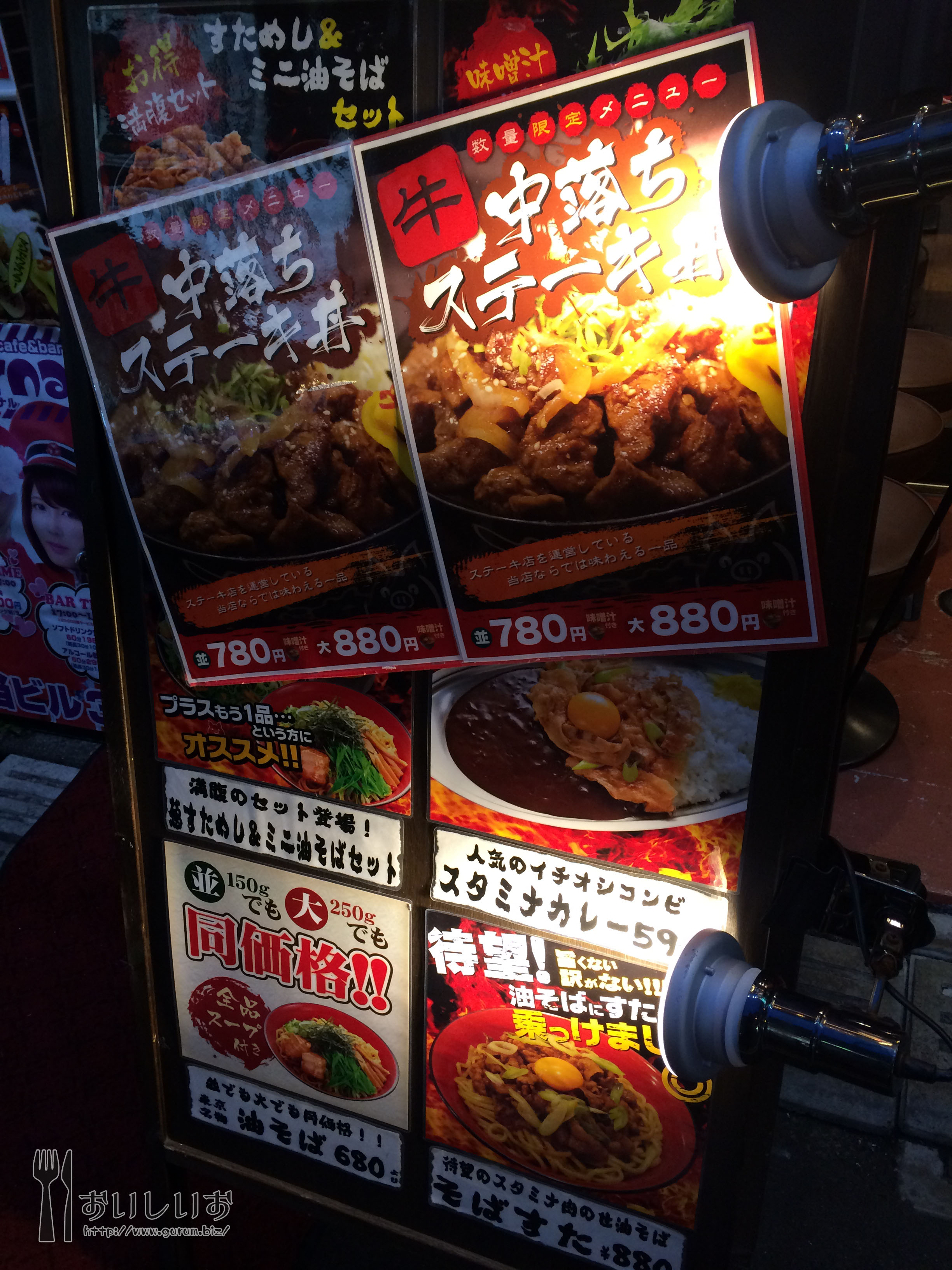 看板。中落ちステーキ丼を推してますね!油そばも出しているという、丼&油そばの強力タッグ!