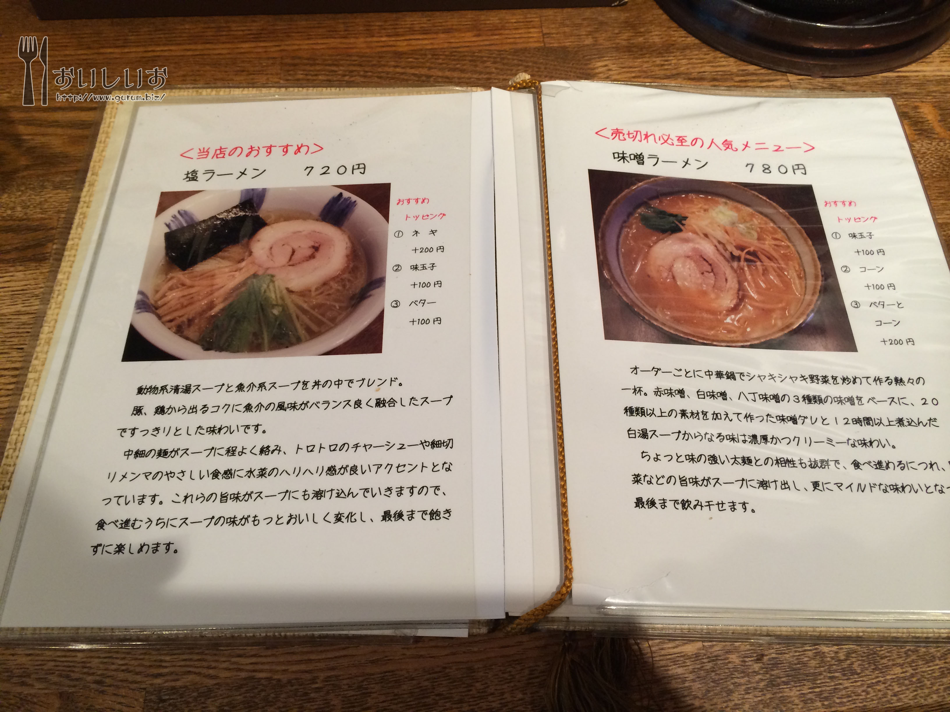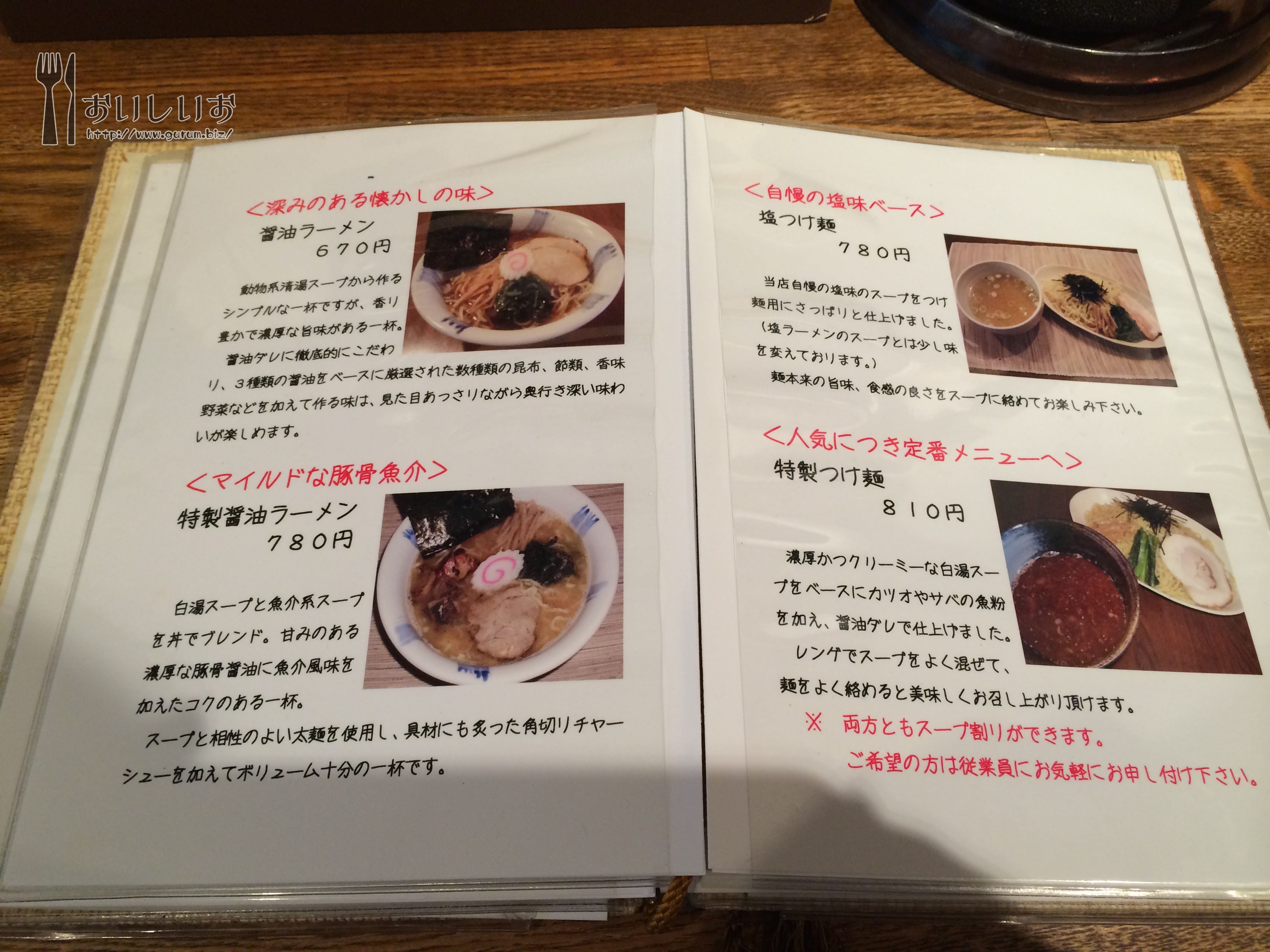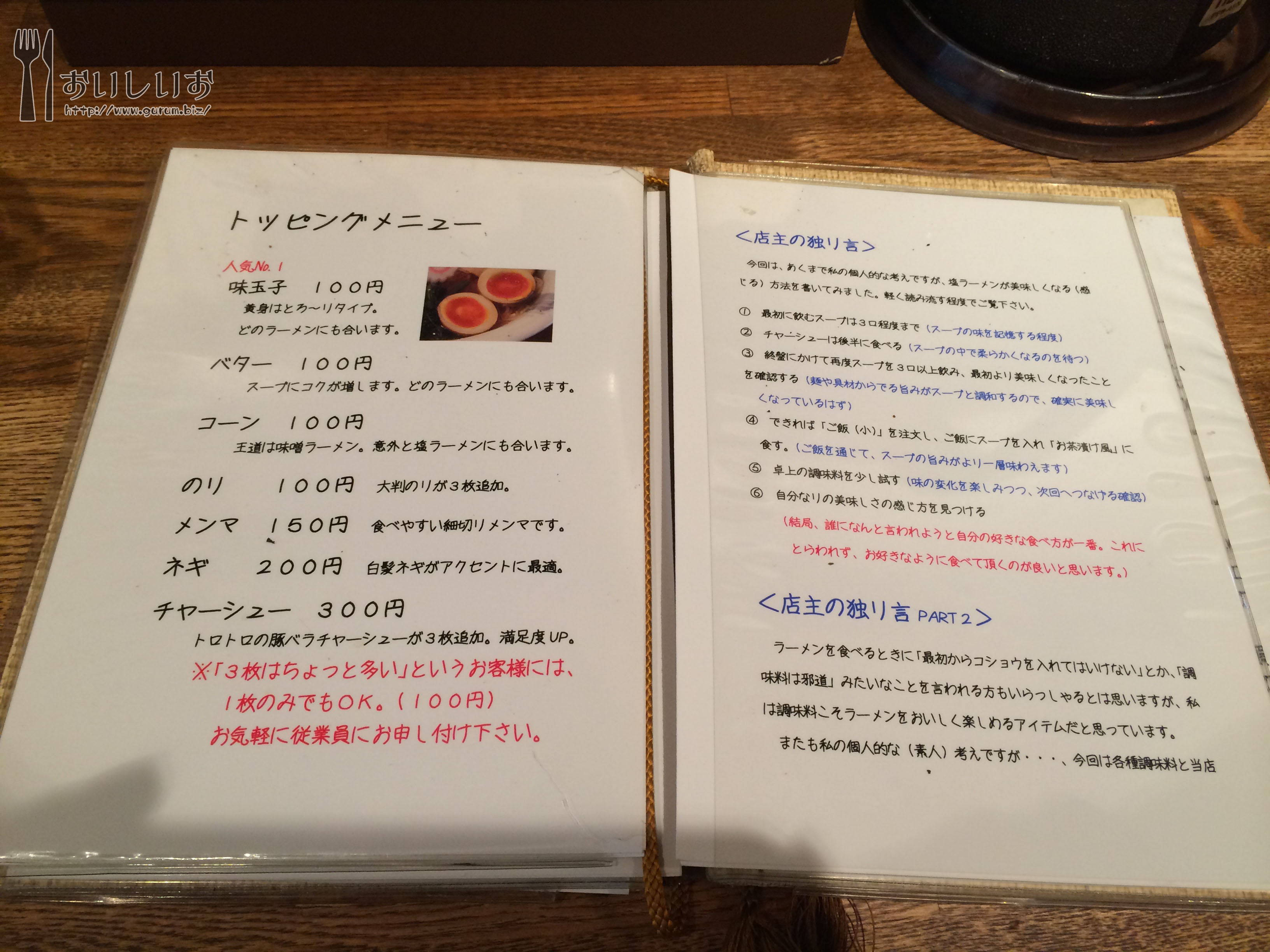 メニュー 店主のラーメンのオススメの食べ方なんかも書いてあります。
