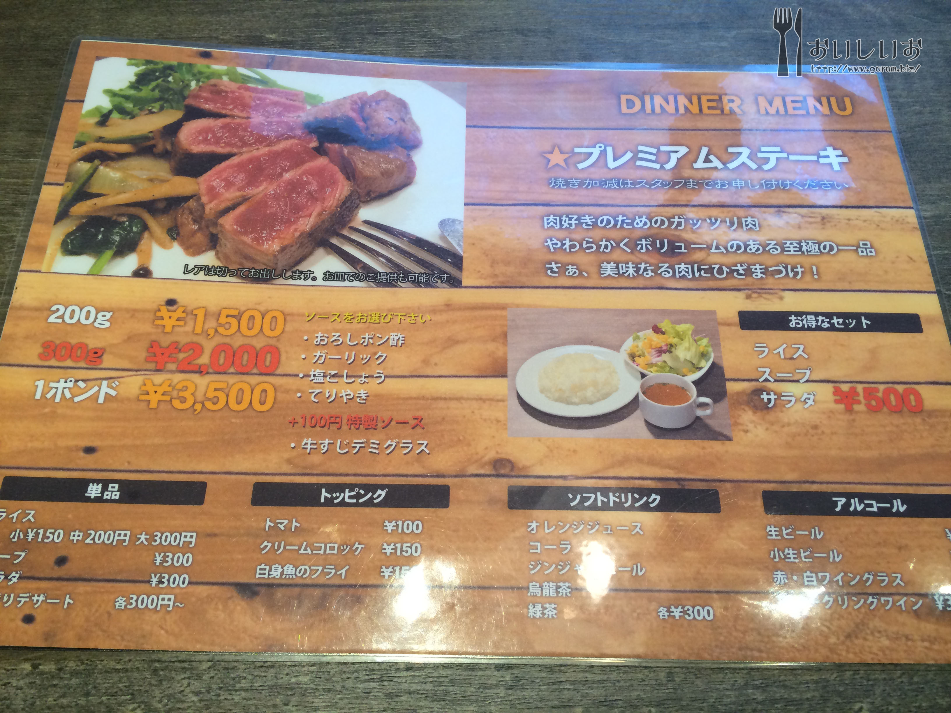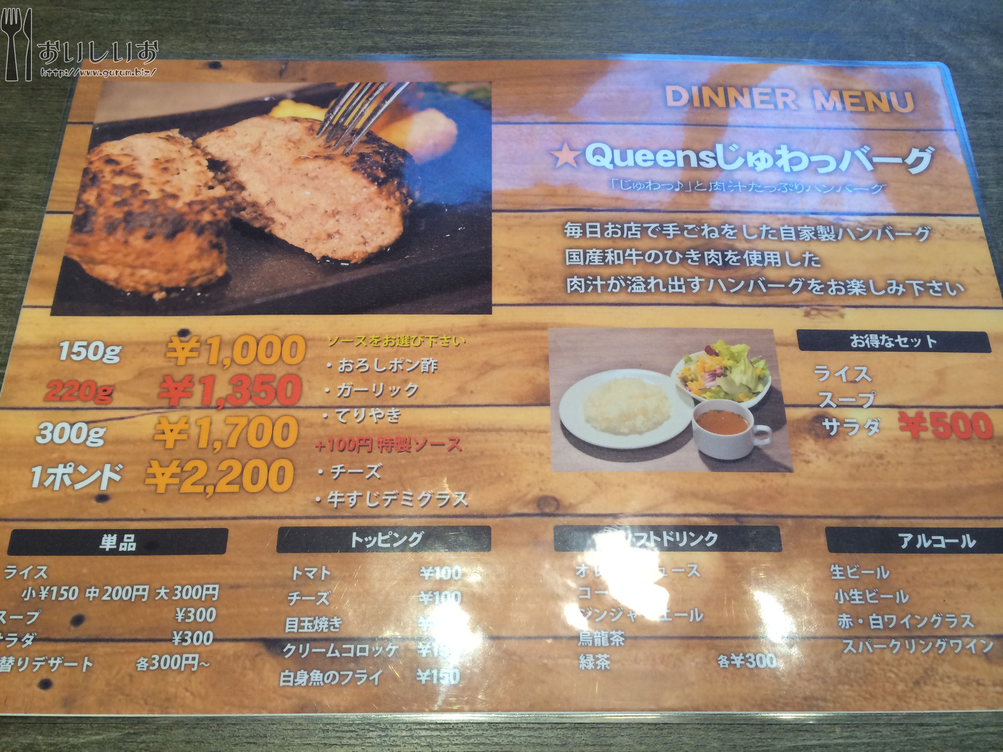 案内されてメニューを見る メニューはこれ一枚?と思ったら、壁にサイドメニュー的なのがありましたが、写真を撮るのを忘れてしまいました。 下の画像の他にもアンチョビポテト、骨付きフランクとチョリソーの盛り合わせなどなど・・・ 今日は2人できたので「Queensじゅわっバーグ1ポンド(2200円)+セット(500円)」と、「プレミアムステーキ1ポンド(3500円)+セット(500円)」にしました! f8cf4630.jpg