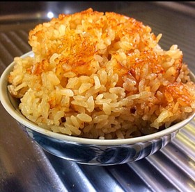 鶏皮を、まだ汁気が残る程度に炒めて、醤油をドバっと入れて飯にかける