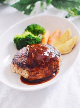 ハンバーグは牛豚合挽きにさらに鶏むねひき肉も混ぜて作ってるわ(´・ω・`)美味しいで?