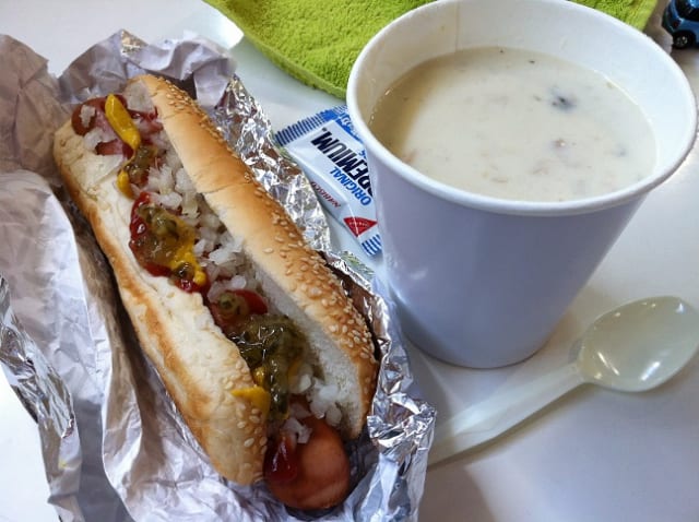クラムチャウダーとスムージーとソフトクリームとホットドッグ