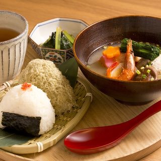 塩結び、豚汁、奈良漬(べったら等の甘い漬け物)→油揚げと小松菜の煮浸し←贅沢。