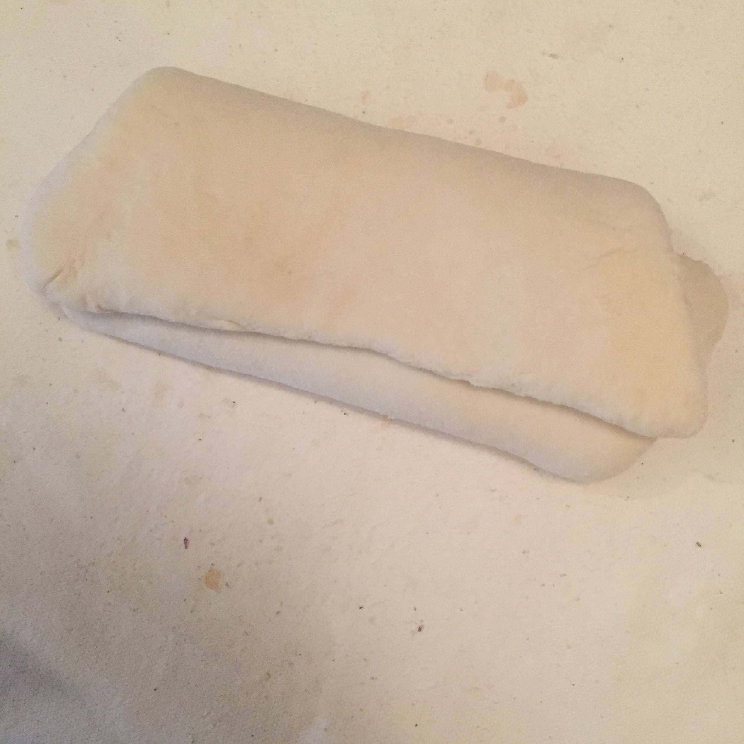 そして伸ばしてその生地を3つ折りにして、麺棒で伸ばします。