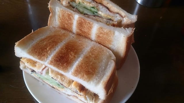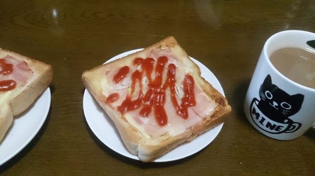 食パン→ハム→チーズ→マヨネーズ→ハム→チーズ→マヨネーズ→焼く→きゅうり→玉ねぎ→マヨネーズ→目玉焼き