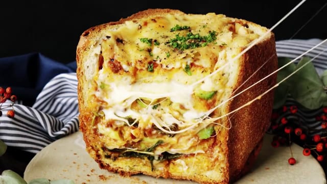 中身ほじくりだしてチーズやベーコン生卵やマヨネーズなどとほじくりだしたパンを層になるように入れてオーブンでじっくり焼いたらどうだろうか 周りが焦げちゃうからアルミホイルまいとこう