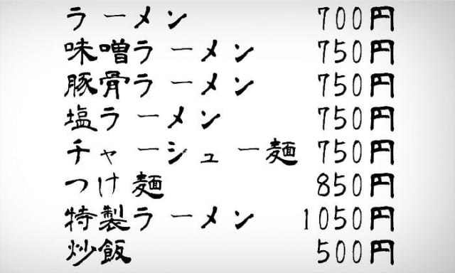 ラーメンとチャーシューメン同じ値段、チャーハンがラーメンよりだいぶ安い、