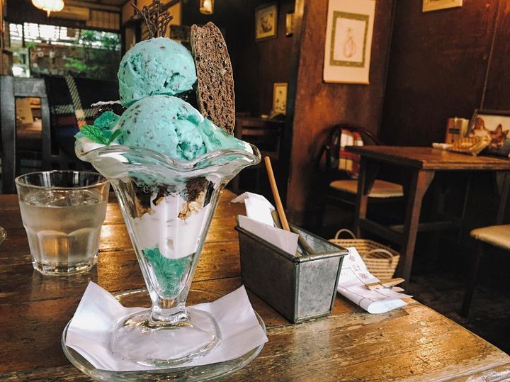 最後の画像のチョコミントパフェ。京都の上京区にある Cafe1001 か