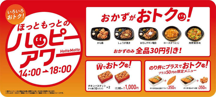 プレナスが展開する持ち帰り弁当の「Hotto Motto((ほっともっと)」は7月10日から、14時~18時の時間帯はお得な価格で利用できる新サービス「ハッピーアワー」を開始する。
