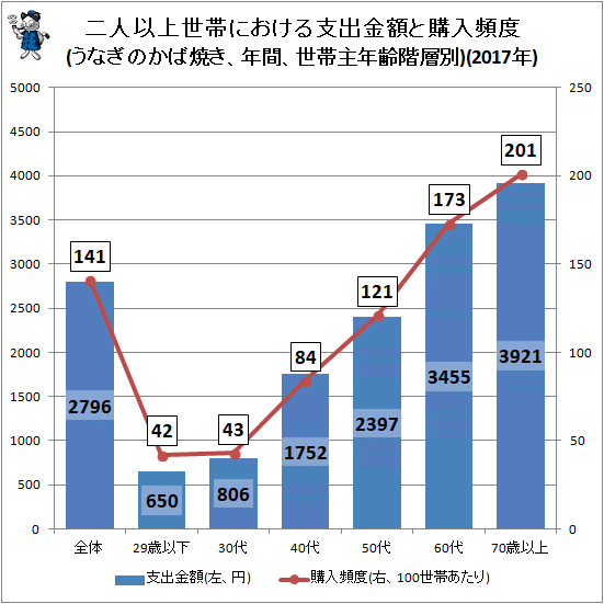 >単身世帯でもうなぎのかば焼きは高齢層ほど多く買われる傾向がある