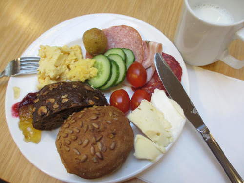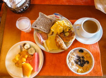 ホテルの朝食だとさらにソーセージと卵にカットフルーツかナッツ付く