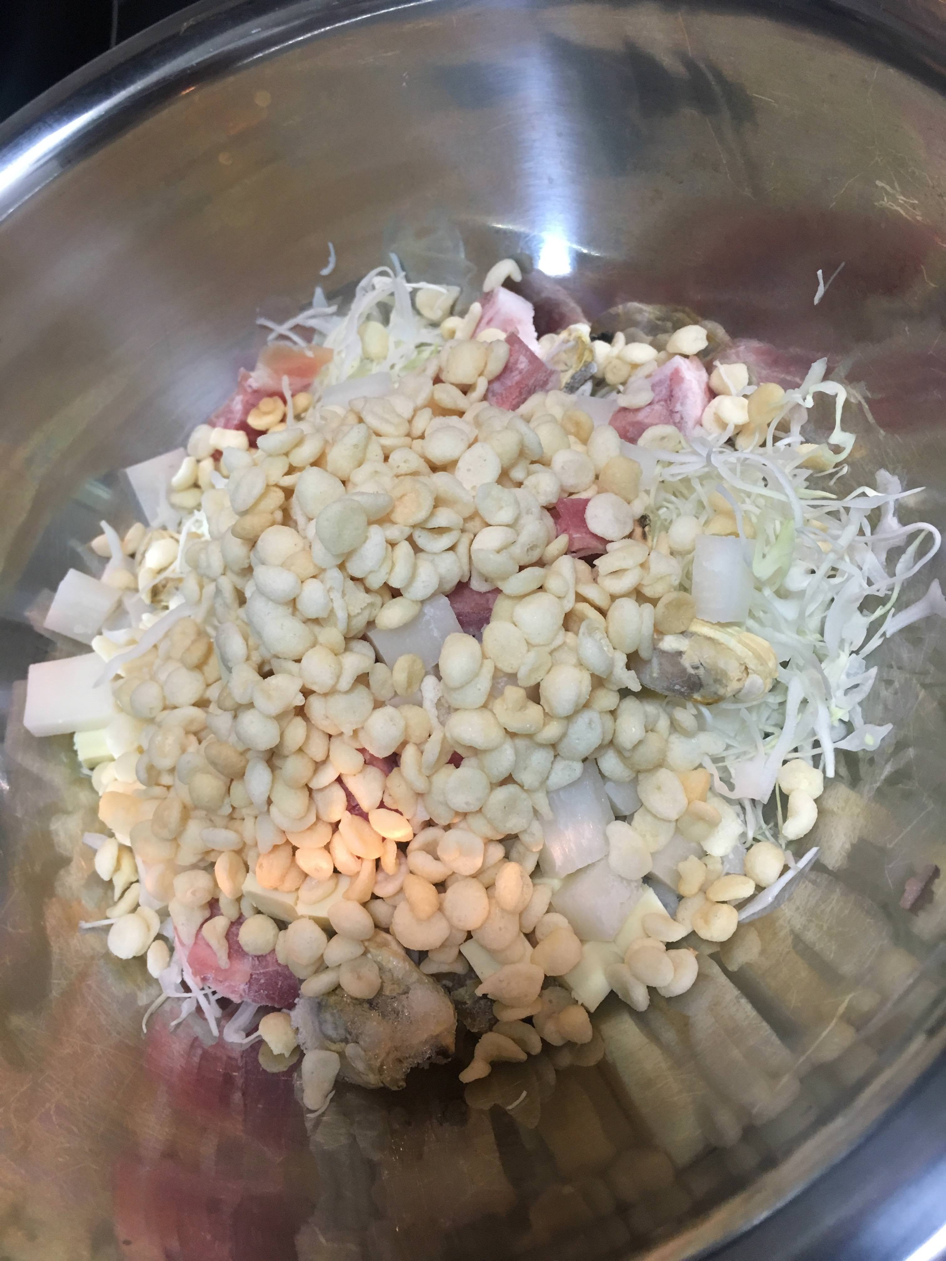 キャベツ豚バラ アサリ もち チーズ 天かす