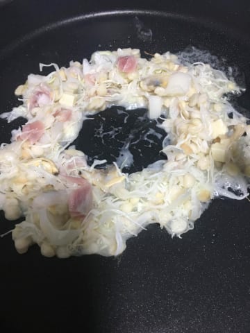 具だけ先に焼いて丸を作って汁入れて焼いて混ぜる、らしいな