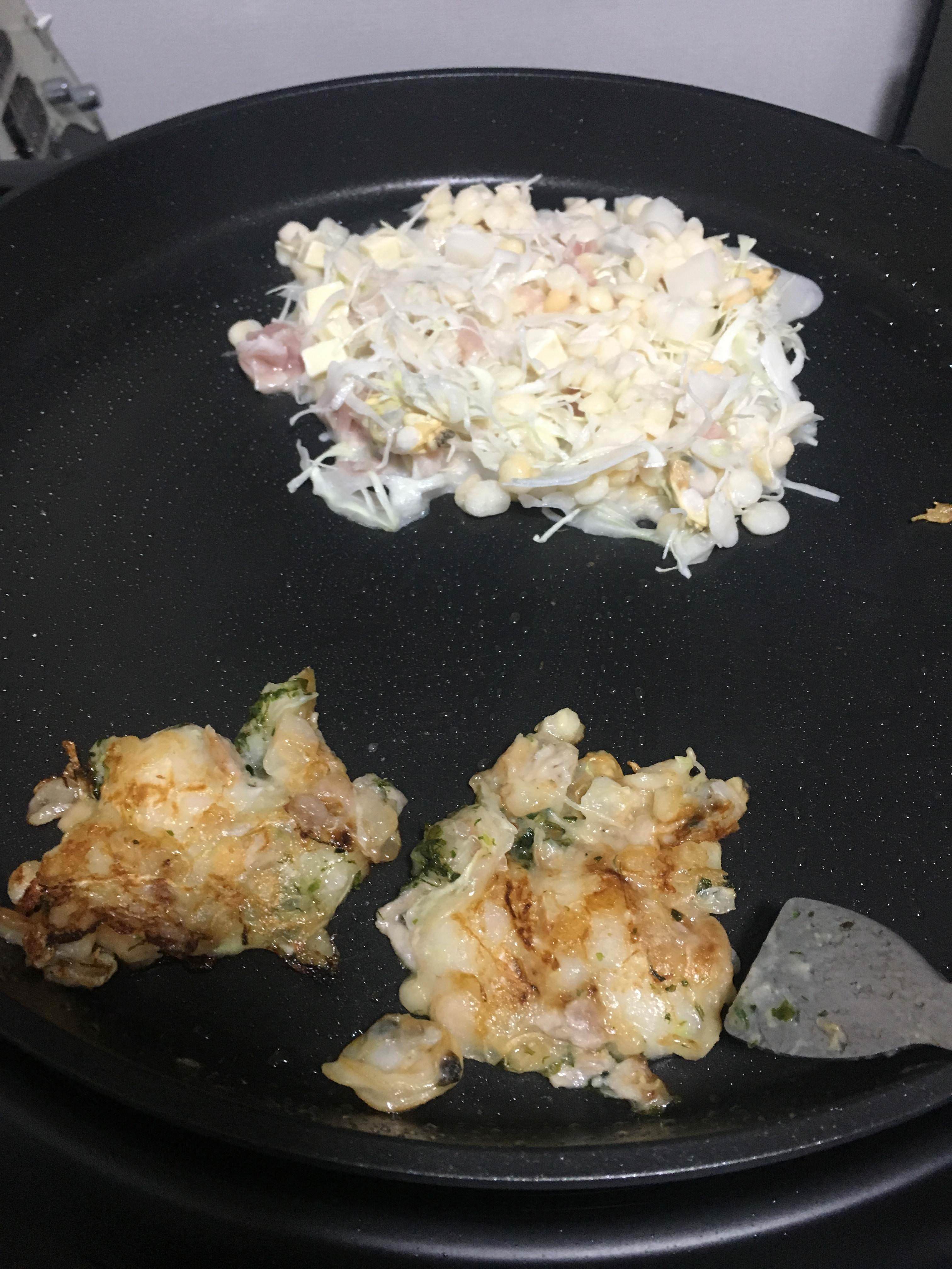 気持ち硬めでダシ作ったからお好み焼きともんじゃのハーフなのかな