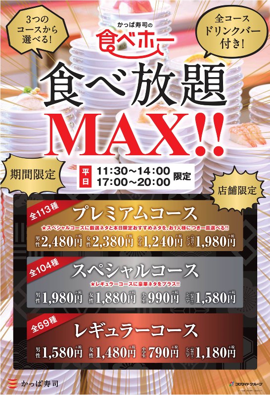 【朗報】かっぱ寿司が食べ放題を夜にも設定、高級ネタコースも!