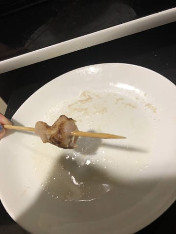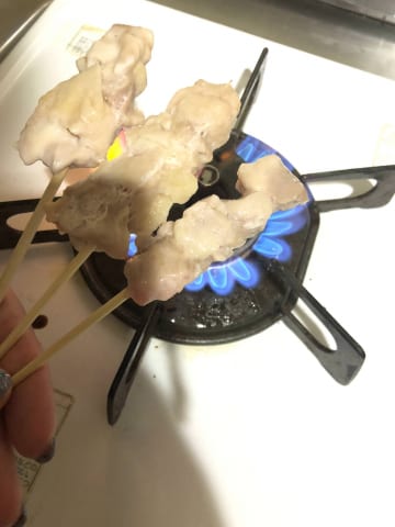 解凍してから焼き方はまず串が燃えないように焼いて途中は串を下から上に貫通させて上下を変える。