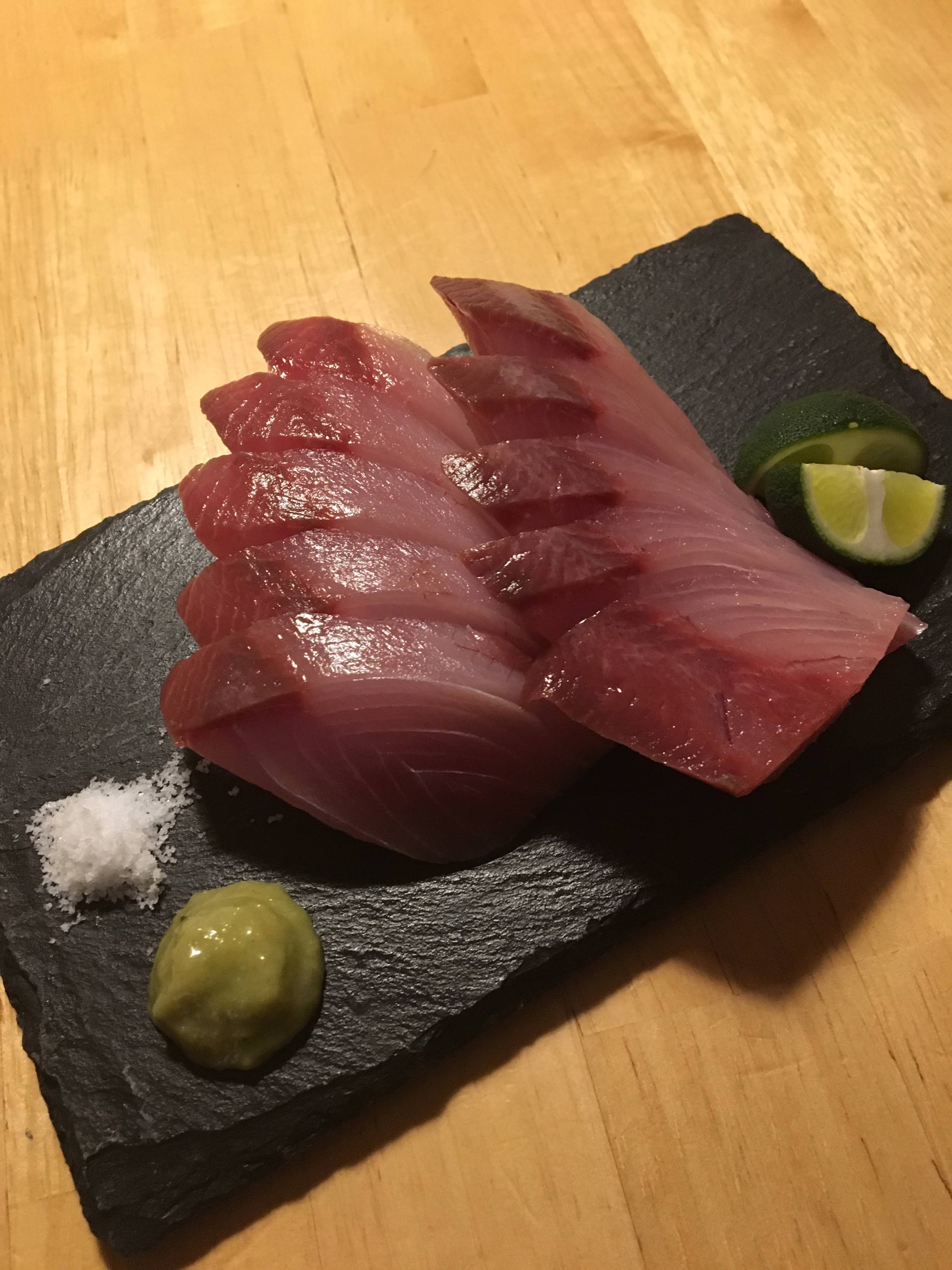 今時期だとイナダかせいぜいワラサだろうから脂の乗ったブリに比べると青魚臭がキツイのでもう少し薄切りにした方がいいと思う。