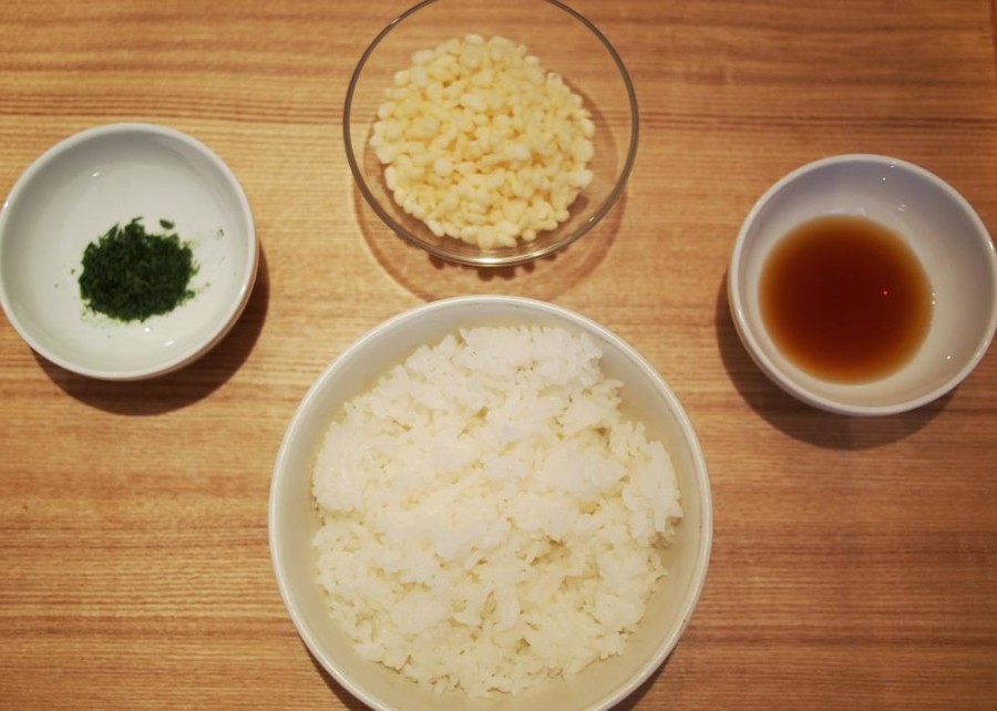 >材料は余ったごはん、天かす、天つゆ、青のり。