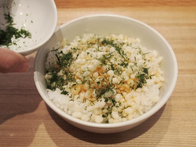 材料は余ったごはん、天かす、天つゆ、青のり。