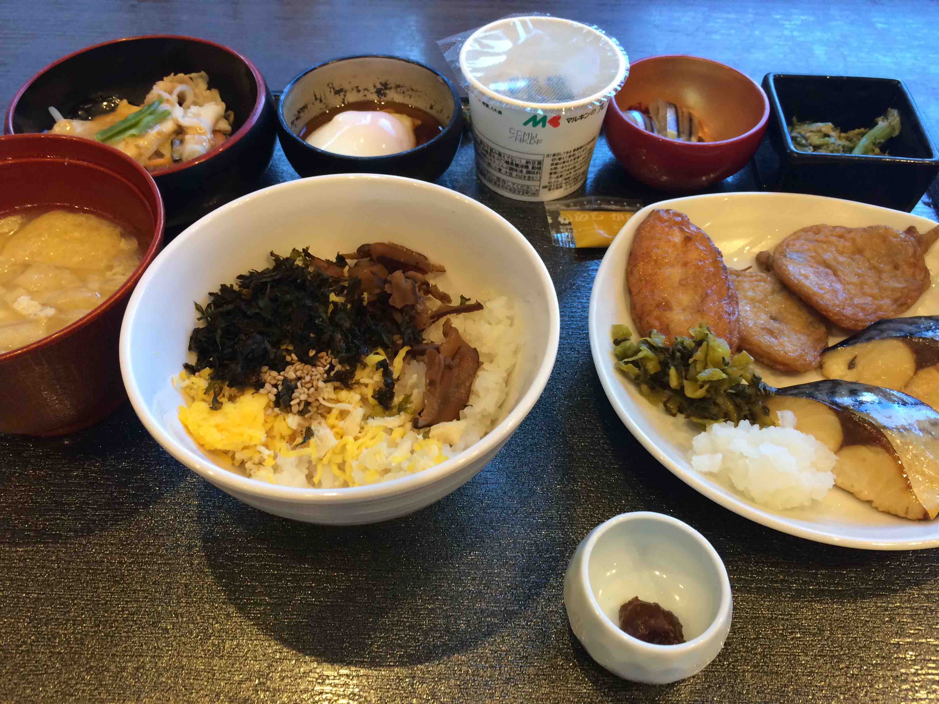 鹿児島の朝食の写真はキビナゴや鶏飯もあるし、下の味噌っぽいのは豚みそかな?それなりに鹿児島感は出てるぞ。
