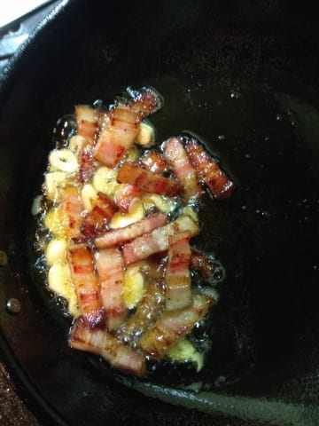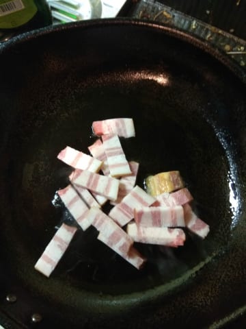少量のオリーブオイルひいてベーコンを焦げ目がつくぐらい炒めてや