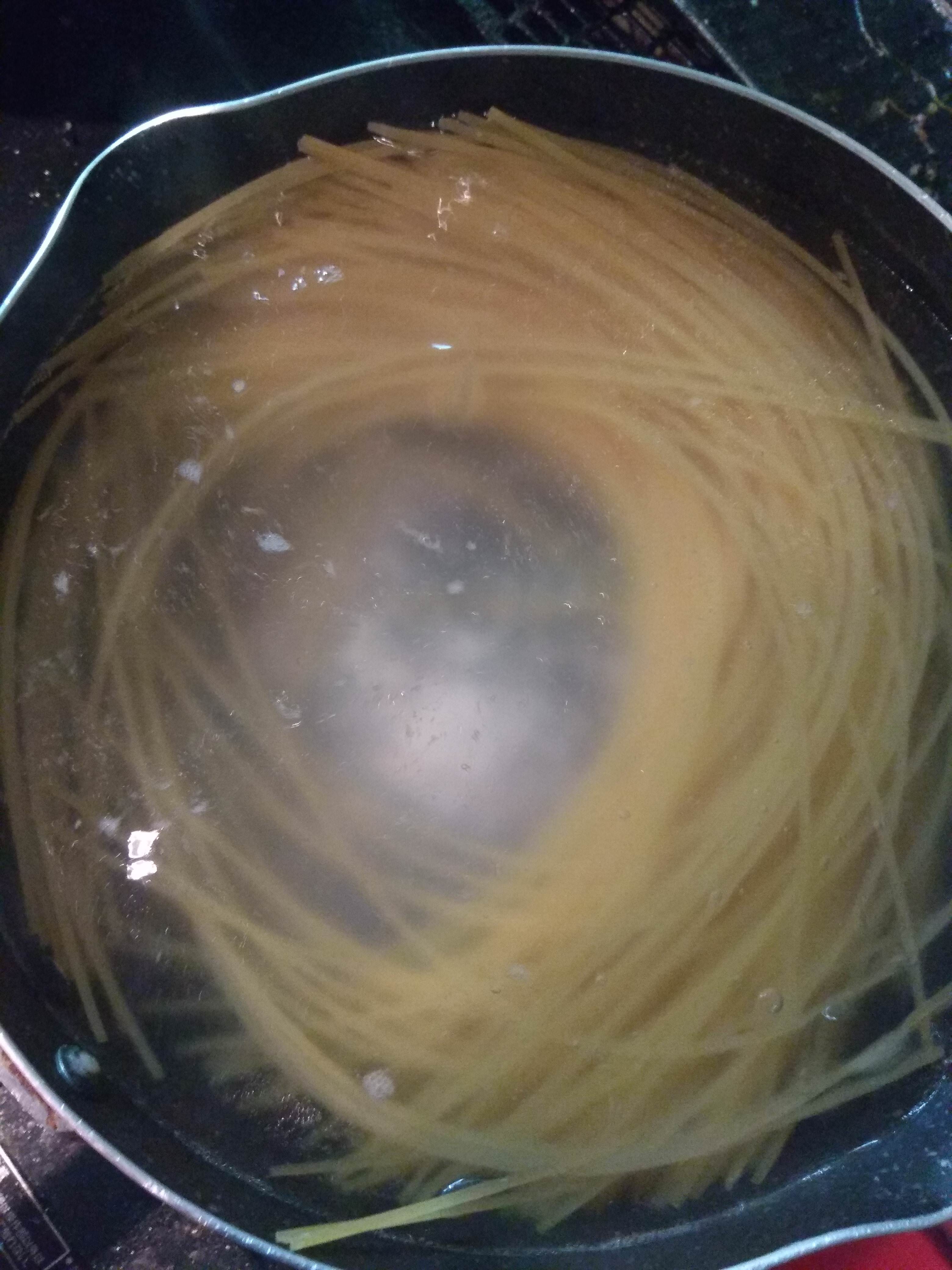 にんにくやってる間にパスタ投入するぞ!スープスパまでいかないけどスープ多めに仕上げるでアルデンテよりもっと固めに仕上げるぞ
