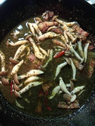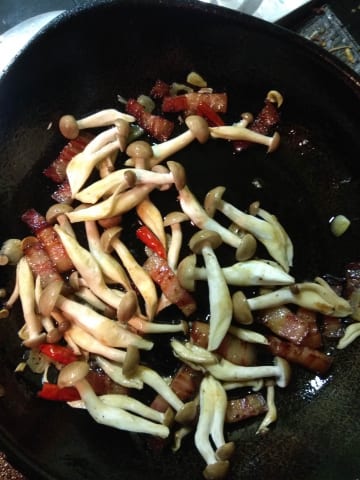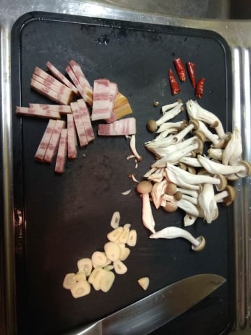 にんにくがいい感じになったらしめじと鷹の爪投入するぞ