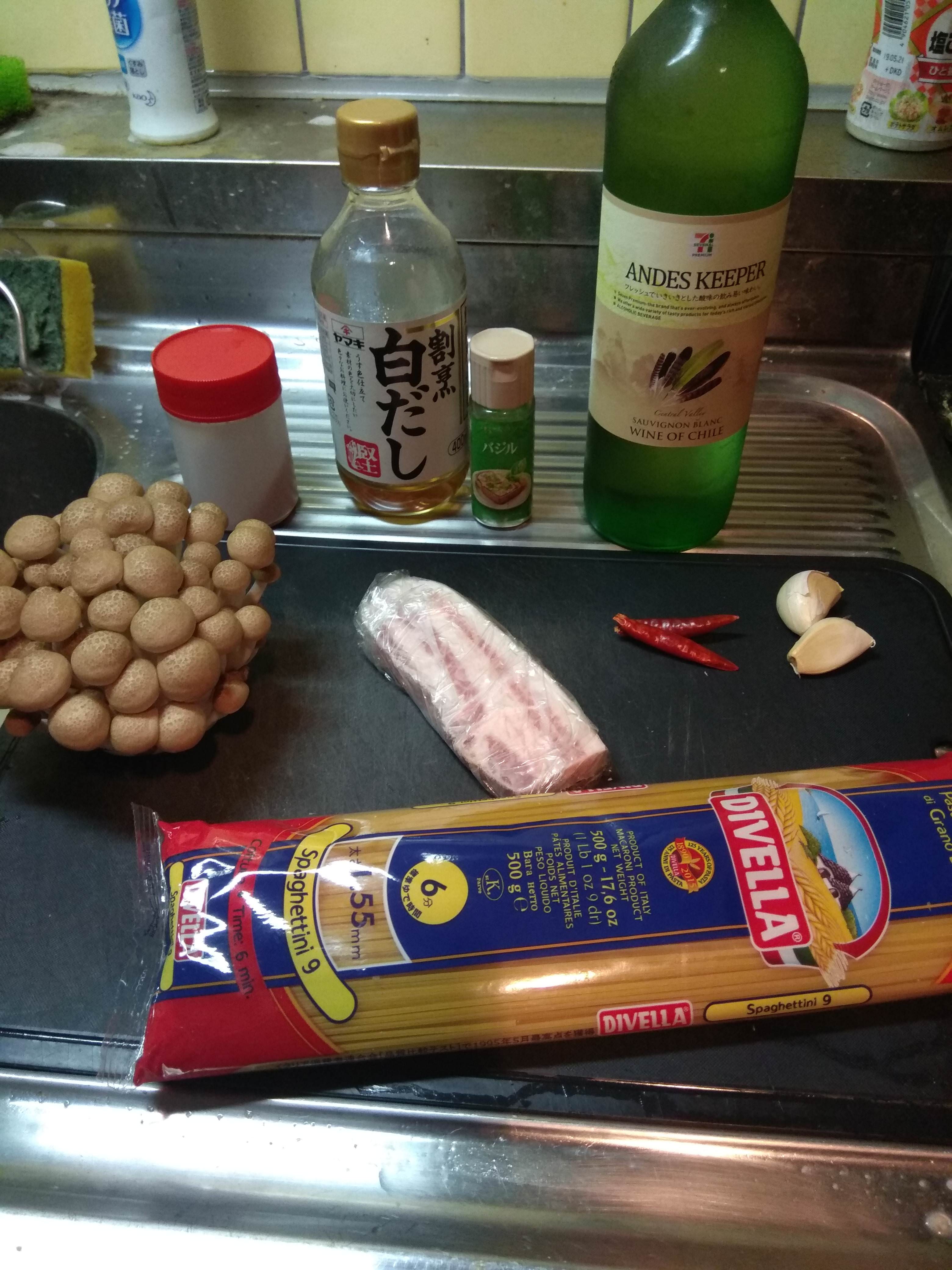 しめじ軽く炒めたらパスタの茹で汁、白だし、コンソメ、バジルをとう