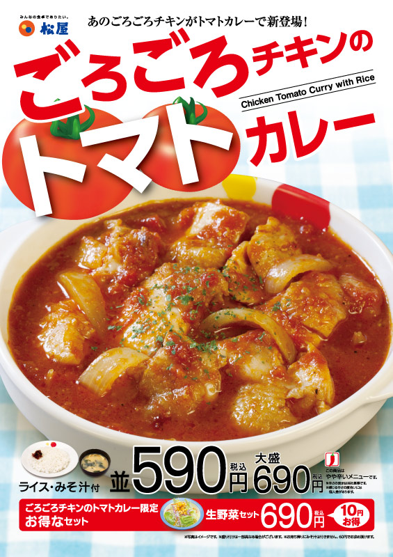 2018年8月7日(火)10時より「ごろごろチキンのトマトカレー」を新発売いたします! 毎回多くのお客様からご好評をいただいている「ごろごろ煮込みチキンカレー」が、今回はトマトカレーで新登場! 「ごろごろチキンのトマトカレー」は、鉄板でジューシーに焼き上げた鶏もも肉をプラスした、ゴロゴロ感たっぷりの食べ応え満点な逸品です。 さらに、「ごろごろチキンのトマトカレー」をご注文のお客様に限り、生野菜が通常価格よりも10円お得にお召し上がりいただける、お得なセットもご用意しております。 松屋自慢の「ごろごろチキンのトマトカレー」を是非お召し上がりください https://www.matsuyafoods.co.jp/2018/08/01/4454/