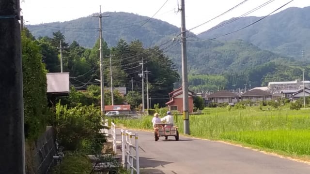 休耕田の向こうに新し目の賃貸とか学校とかどの規模の田舎か結構わかる