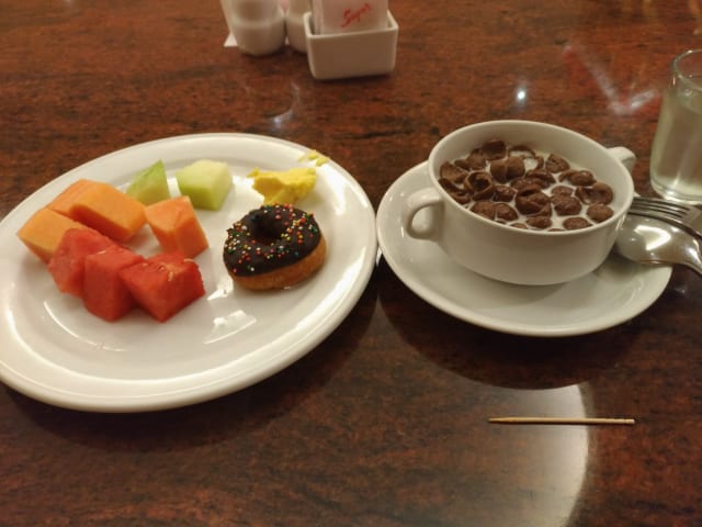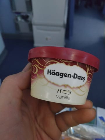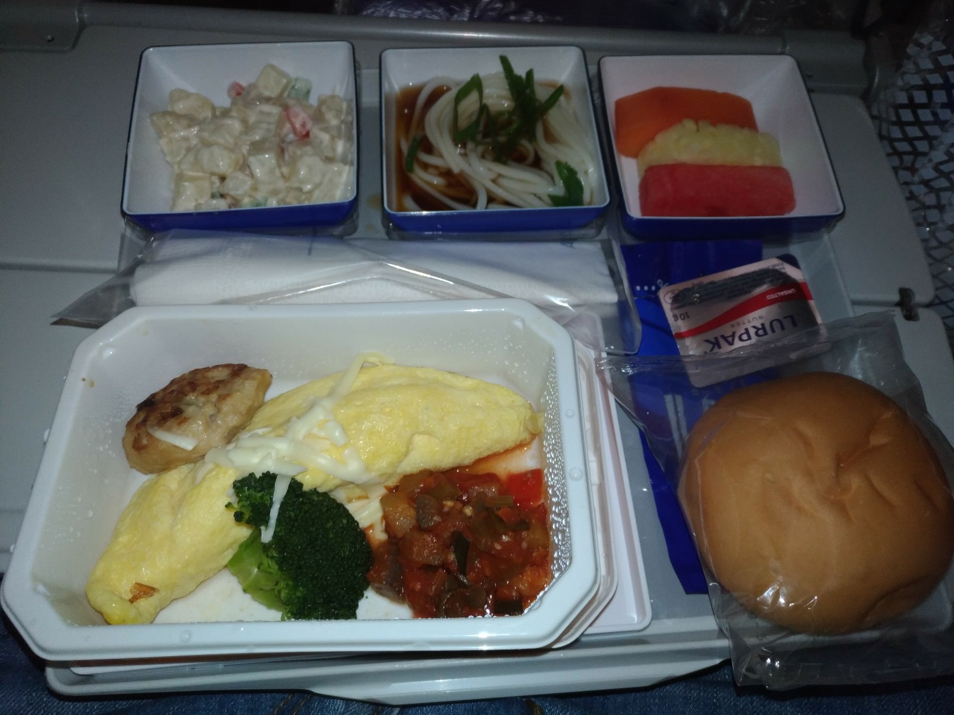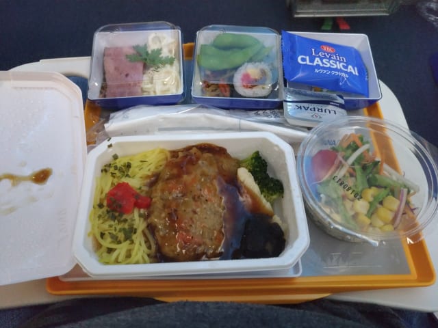 行きの機内食、メインはハンバーグスパゲティって事だろうか