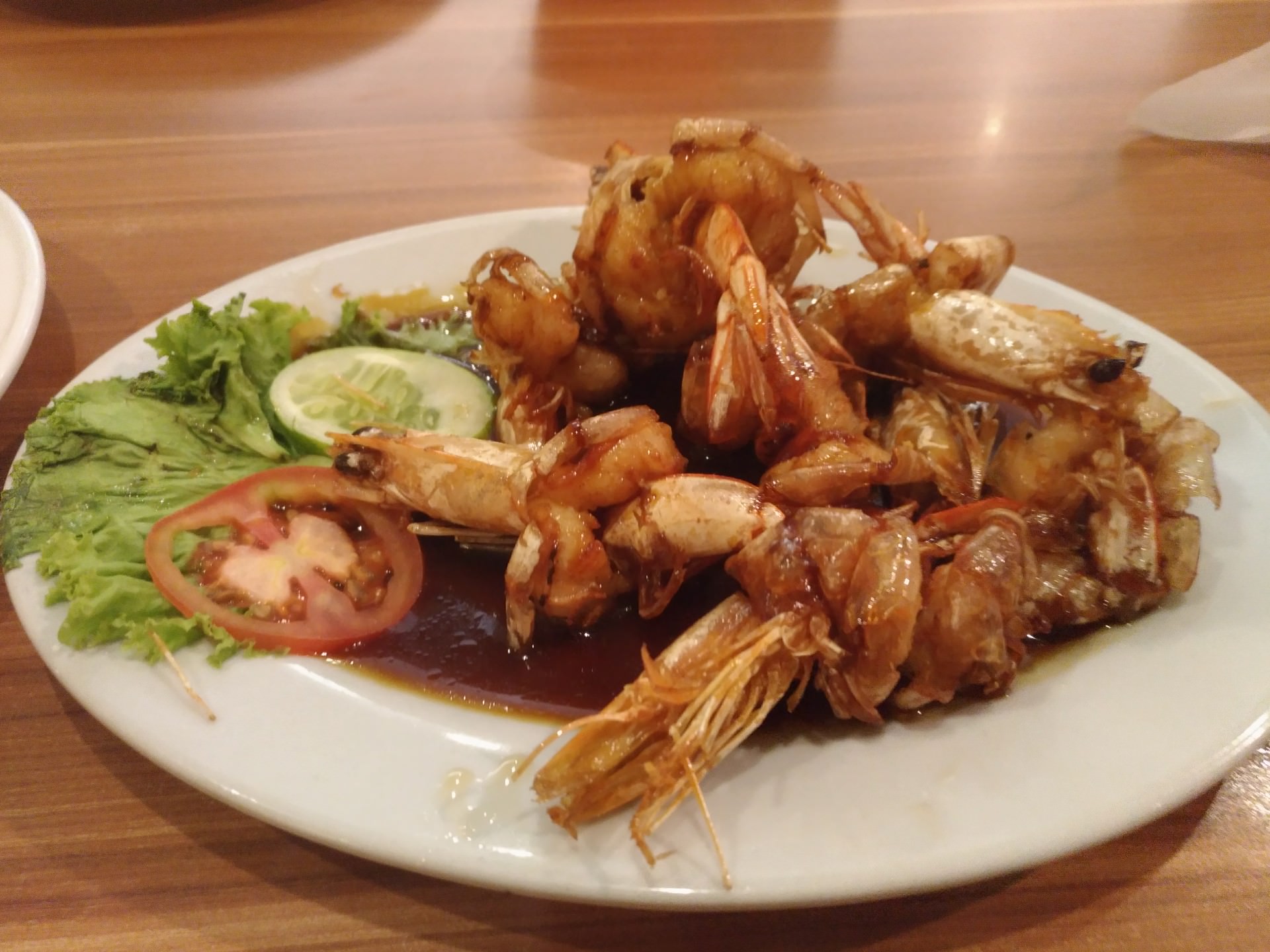 適当に指さしたらエビのフライを甘くどく煮た料理出てきた