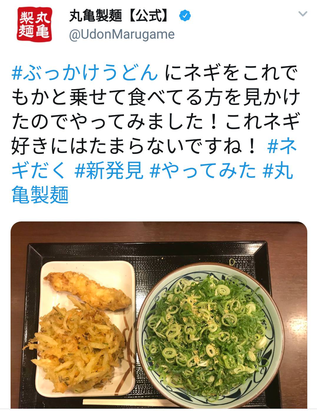 丸亀製麺は2018年8月24日のツイートで、器からこぼれるほど大量の青ネギを盛り付けたうどんの写真をアップしながら、