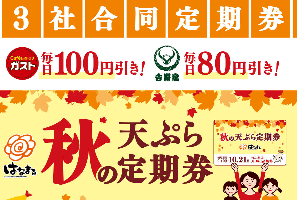 https://www.hanamaruudon.com/tempurapass2018autumn/ ガストも加わり、3社合同定期券へ