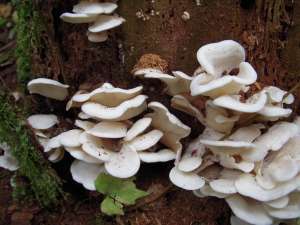 スギヒラタケは、キシメジ科スギヒラタケ属のきのこです。日本ではスギ、マツ等の針葉樹の切り株や倒木に主に8月から10月頃にかけて発生し、右下の写真のように、傘が2~6 cm程度の大きさの耳形又は扇形の白いきのこがいくつも重なり合って群れて生えるのが特徴です。
