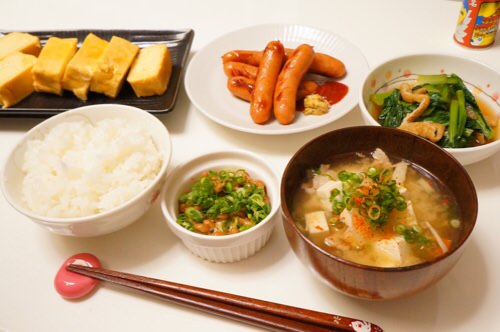 ご飯と味噌汁に、ウインナーか卵焼きがあれば良いわ